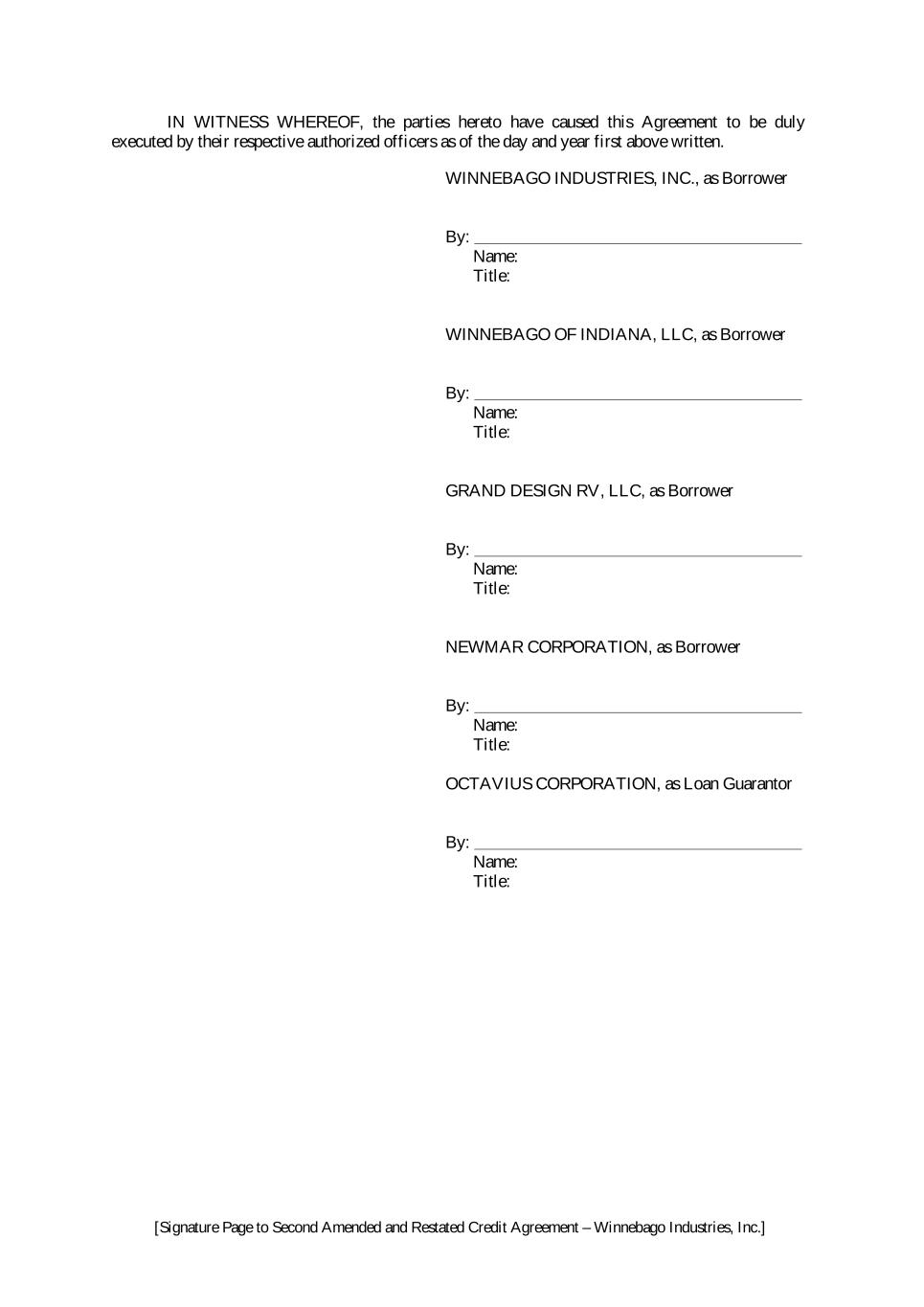 IN WITNESS WHEREOF, the parties hereto have caused this Agreement to be duly executed by their respective authorized officers as of the day and year first above written. WINNEBAGO INDUSTRIES, INC., as Borrower By: Name: Title: WINNEBAGO OF INDIANA, LLC, as Borrower By: Name: Title: GRAND DESIGN RV, LLC, as Borrower By: Name: Title: NEWMAR CORPORATION, as Borrower By: Name: Title: OCTAVIUS CORPORATION, as Loan Guarantor By: Name: Title: [Signature Page to Second Amended and Restated Credit Agreement – Winnebago Industries, Inc.]