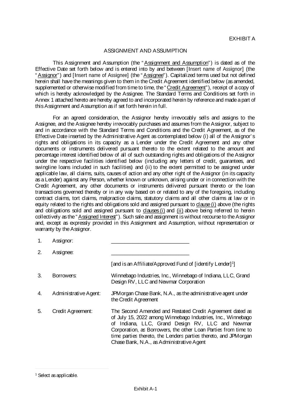 Exhibit A-1 [and is an Affiliate/Approved Fund of [identify Lender]1] 3. Borrowers: 2. Winnebago Industries, Inc., Winnebago of Indiana, LLC, Grand Design RV, LLC and Newmar Corporation 1. Assignee: 4. Administrative Agent: _____________________________ JPMorgan Chase Bank, N.A., as the administrative agent under the Credit Agreement Assignor: 5. EXHIBIT A ASSIGNMENT AND ASSUMPTION This Assignment and Assumption (the “Assignment and Assumption”) is dated as of the Effective Date set forth below and is entered into by and between [Insert name of Assignor] (the “Assignor”) and [Insert name of Assignee] (the “Assignee”). Capitalized terms used but not defined herein shall have the meanings given to them in the Credit Agreement identified below (as amended, supplemented or otherwise modified from time to time, the “Credit Agreement”), receipt of a copy of which is hereby acknowledged by the Assignee. The Standard Terms and Conditions set forth in Annex 1 attached hereto are hereby agreed to and incorporated herein by reference and made a part of this Assignment and Assumption as if set forth herein in full. For an agreed consideration, the Assignor hereby irrevocably sells and assigns to the Assignee, and the Assignee hereby irrevocably purchases and assumes from the Assignor, subject to and in accordance with the Standard Terms and Conditions and the Credit Agreement, as of the Effective Date inserted by the Administrative Agent as contemplated below (i) all of the Assignor’s rights and obligations in its capacity as a Lender under the Credit Agreement and any other documents or instruments delivered pursuant thereto to the extent related to the amount and percentage interest identified below of all of such outstanding rights and obligations of the Assignor under the respective facilities identified below (including any letters of credit, guarantees, and swingline loans included in such facilities) and (ii) to the extent permitted to be assigned under applicable law, all claims, suits, causes of action and any other right of the Assignor (in its capacity as a Lender) against any Person, whether known or unknown, arising under or in connection with the Credit Agreement, any other documents or instruments delivered pursuant thereto or the loan transactions governed thereby or in any way based on or related to any of the foregoing, including contract claims, tort claims, malpractice claims, statutory claims and all other claims at law or in equity related to the rights and obligations sold and assigned pursuant to clause (i) above (the rights and obligations sold and assigned pursuant to clauses (i) and (ii) above being referred to herein collectively as the “Assigned Interest”). Such sale and assignment is without recourse to the Assignor and, except as expressly provided in this Assignment and Assumption, without representation or warranty by the Assignor. Credit Agreement: The Second Amended and Restated Credit Agreement dated as of July 15, 2022 among Winnebago Industries, Inc., Winnebago of Indiana, LLC, Grand Design RV, LLC and Newmar Corporation, as Borrowers, the other Loan Parties from time to time parties thereto, the Lenders parties thereto, and JPMorgan Chase Bank, N.A., as Administrative Agent _____________________________ 1 Select as applicable.