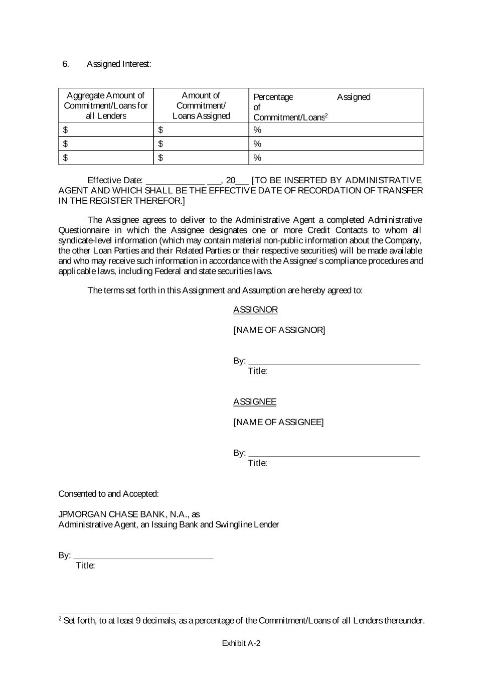 Exhibit A-2 $ $ % $ 6. $ Aggregate Amount of Commitment/Loans for all Lenders % Amount of Commitment/ Loans Assigned $ Assigned Interest: $ Percentage Assigned of Commitment/Loans2 % Effective Date: _____________ ___, 20___ [TO BE INSERTED BY ADMINISTRATIVE AGENT AND WHICH SHALL BE THE EFFECTIVE DATE OF RECORDATION OF TRANSFER IN THE REGISTER THEREFOR.] The Assignee agrees to deliver to the Administrative Agent a completed Administrative Questionnaire in which the Assignee designates one or more Credit Contacts to whom all syndicate-level information (which may contain material non-public information about the Company, the other Loan Parties and their Related Parties or their respective securities) will be made available and who may receive such information in accordance with the Assignee’s compliance procedures and applicable laws, including Federal and state securities laws. The terms set forth in this Assignment and Assumption are hereby agreed to: ASSIGNOR [NAME OF ASSIGNOR] By: Title: ASSIGNEE [NAME OF ASSIGNEE] By: Title: Consented to and Accepted: JPMORGAN CHASE BANK, N.A., as Administrative Agent, an Issuing Bank and Swingline Lender By: Title: 2 Set forth, to at least 9 decimals, as a percentage of the Commitment/Loans of all Lenders thereunder.