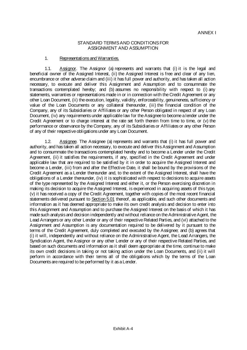 ANNEX I STANDARD TERMS AND CONDITIONS FOR ASSIGNMENT AND ASSUMPTION 1. Representations and Warranties. 1.1. Assignor. The Assignor (a) represents and warrants that (i) it is the legal and beneficial owner of the Assigned Interest, (ii) the Assigned Interest is free and clear of any lien, encumbrance or other adverse claim and (iii) it has full power and authority, and has taken all action necessary, to execute and deliver this Assignment and Assumption and to consummate the transactions contemplated hereby; and (b) assumes no responsibility with respect to (i) any statements, warranties or representations made in or in connection with the Credit Agreement or any other Loan Document, (ii) the execution, legality, validity, enforceability, genuineness, sufficiency or value of the Loan Documents or any collateral thereunder, (iii) the financial condition of the Company, any of its Subsidiaries or Affiliates or any other Person obligated in respect of any Loan Document, (iv) any requirements under applicable law for the Assignee to become a lender under the Credit Agreement or to charge interest at the rate set forth therein from time to time, or (v) the performance or observance by the Company, any of its Subsidiaries or Affiliates or any other Person of any of their respective obligations under any Loan Document. 1.2. Assignee. The Assignee (a) represents and warrants that (i) it has full power and authority, and has taken all action necessary, to execute and deliver this Assignment and Assumption and to consummate the transactions contemplated hereby and to become a Lender under the Credit Agreement, (ii) it satisfies the requirements, if any, specified in the Credit Agreement and under applicable law that are required to be satisfied by it in order to acquire the Assigned Interest and become a Lender, (iii) from and after the Effective Date, it shall be bound by the provisions of the Credit Agreement as a Lender thereunder and, to the extent of the Assigned Interest, shall have the obligations of a Lender thereunder, (iv) it is sophisticated with respect to decisions to acquire assets of the type represented by the Assigned Interest and either it, or the Person exercising discretion in making its decision to acquire the Assigned Interest, is experienced in acquiring assets of this type, (v) it has received a copy of the Credit Agreement, together with copies of the most recent financial statements delivered pursuant to Section 5.01 thereof, as applicable, and such other documents and information as it has deemed appropriate to make its own credit analysis and decision to enter into this Assignment and Assumption and to purchase the Assigned Interest on the basis of which it has made such analysis and decision independently and without reliance on the Administrative Agent, the Lead Arrangers or any other Lender or any of their respective Related Parties, and (vi) attached to the Assignment and Assumption is any documentation required to be delivered by it pursuant to the terms of the Credit Agreement, duly completed and executed by the Assignee; and (b) agrees that (i) it will, independently and without reliance on the Administrative Agent, the Lead Arrangers, the Syndication Agent, the Assignor or any other Lender or any of their respective Related Parties, and based on such documents and information as it shall deem appropriate at the time, continue to make its own credit decisions in taking or not taking action under the Loan Documents, and (ii) it will perform in accordance with their terms all of the obligations which by the terms of the Loan Documents are required to be performed by it as a Lender. Exhibit A-4