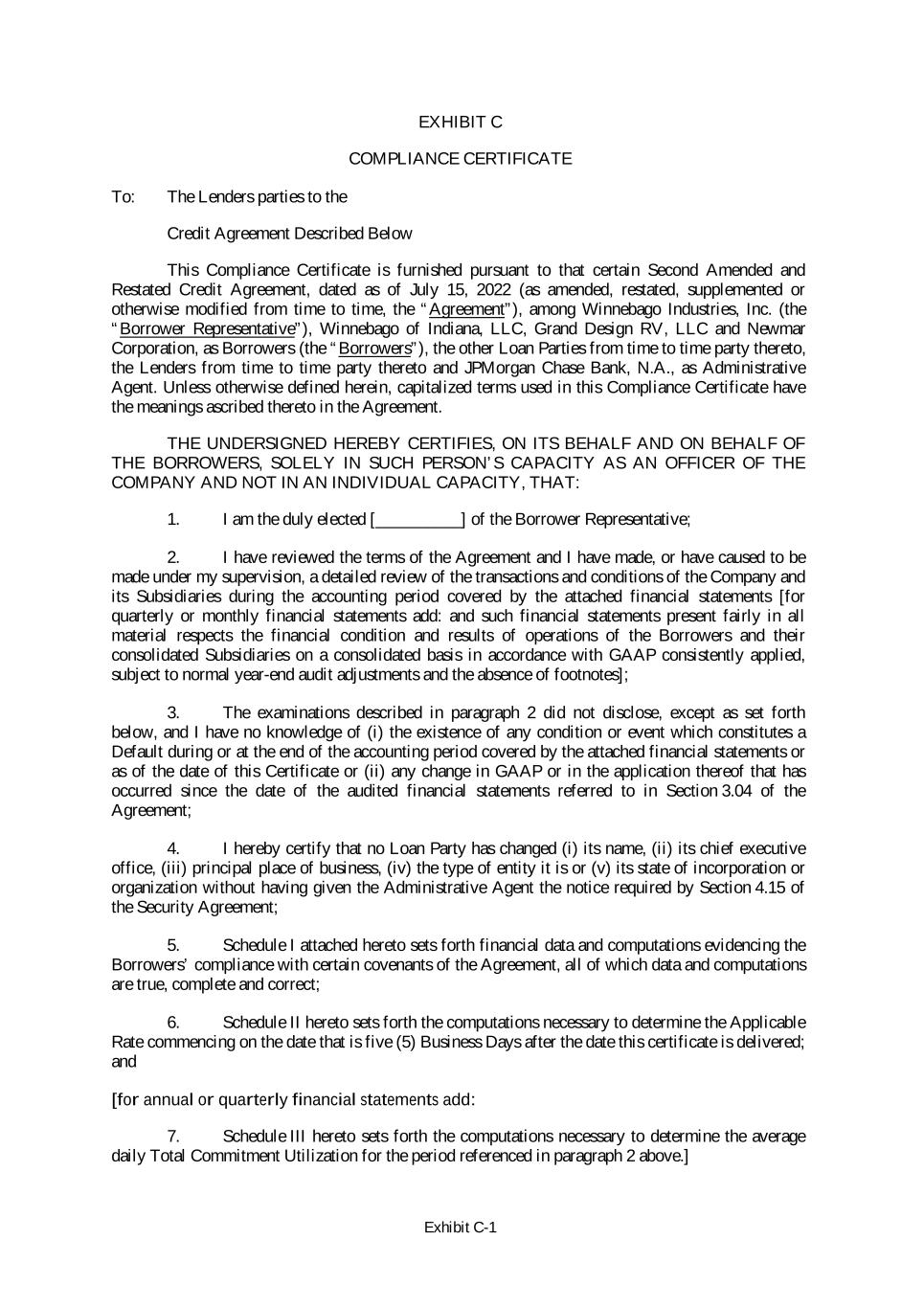 EXHIBIT C COMPLIANCE CERTIFICATE To: The Lenders parties to the Credit Agreement Described Below This Compliance Certificate is furnished pursuant to that certain Second Amended and Restated Credit Agreement, dated as of July 15, 2022 (as amended, restated, supplemented or otherwise modified from time to time, the “Agreement”), among Winnebago Industries, Inc. (the “Borrower Representative”), Winnebago of Indiana, LLC, Grand Design RV, LLC and Newmar Corporation, as Borrowers (the “Borrowers”), the other Loan Parties from time to time party thereto, the Lenders from time to time party thereto and JPMorgan Chase Bank, N.A., as Administrative Agent. Unless otherwise defined herein, capitalized terms used in this Compliance Certificate have the meanings ascribed thereto in the Agreement. THE UNDERSIGNED HEREBY CERTIFIES, ON ITS BEHALF AND ON BEHALF OF THE BORROWERS, SOLELY IN SUCH PERSON’S CAPACITY AS AN OFFICER OF THE COMPANY AND NOT IN AN INDIVIDUAL CAPACITY, THAT: 1. I am the duly elected [__________] of the Borrower Representative; 2. I have reviewed the terms of the Agreement and I have made, or have caused to be made under my supervision, a detailed review of the transactions and conditions of the Company and its Subsidiaries during the accounting period covered by the attached financial statements [for quarterly or monthly financial statements add: and such financial statements present fairly in all material respects the financial condition and results of operations of the Borrowers and their consolidated Subsidiaries on a consolidated basis in accordance with GAAP consistently applied, subject to normal year-end audit adjustments and the absence of footnotes]; 3. The examinations described in paragraph 2 did not disclose, except as set forth below, and I have no knowledge of (i) the existence of any condition or event which constitutes a Default during or at the end of the accounting period covered by the attached financial statements or as of the date of this Certificate or (ii) any change in GAAP or in the application thereof that has occurred since the date of the audited financial statements referred to in Section 3.04 of the Agreement; 4. I hereby certify that no Loan Party has changed (i) its name, (ii) its chief executive office, (iii) principal place of business, (iv) the type of entity it is or (v) its state of incorporation or organization without having given the Administrative Agent the notice required by Section 4.15 of the Security Agreement; 5. Schedule I attached hereto sets forth financial data and computations evidencing the Borrowers’ compliance with certain covenants of the Agreement, all of which data and computations are true, complete and correct; 6. Schedule II hereto sets forth the computations necessary to determine the Applicable Rate commencing on the date that is five (5) Business Days after the date this certificate is delivered; and [for annual or quarterly financial statements add: 7. Schedule III hereto sets forth the computations necessary to determine the average daily Total Commitment Utilization for the period referenced in paragraph 2 above.] Exhibit C-1
