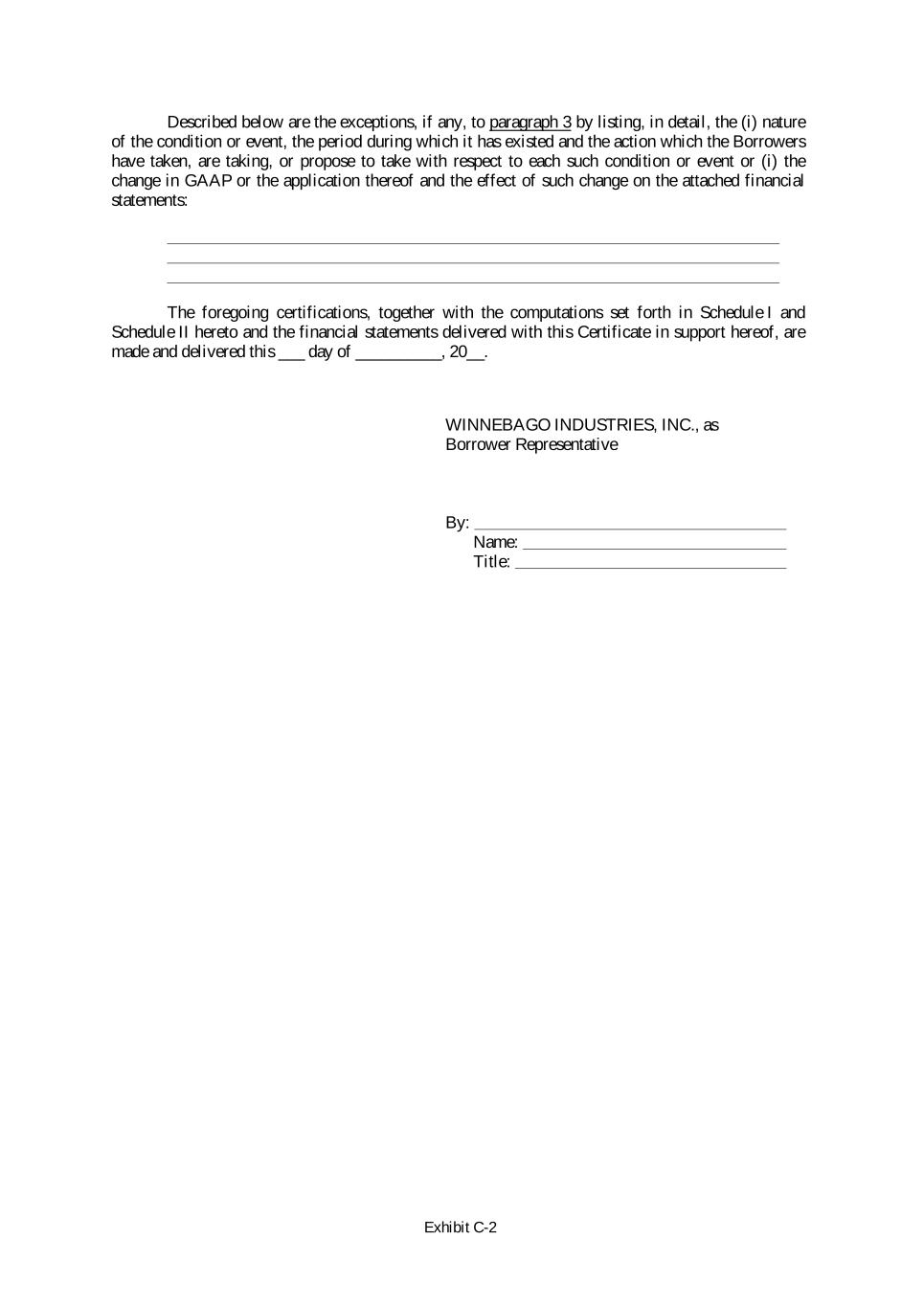 Described below are the exceptions, if any, to paragraph 3 by listing, in detail, the (i) nature of the condition or event, the period during which it has existed and the action which the Borrowers have taken, are taking, or propose to take with respect to each such condition or event or (i) the change in GAAP or the application thereof and the effect of such change on the attached financial statements: The foregoing certifications, together with the computations set forth in Schedule I and Schedule II hereto and the financial statements delivered with this Certificate in support hereof, are made and delivered this ___ day of __________, 20__. WINNEBAGO INDUSTRIES, INC., as Borrower Representative By: Name: Title: Exhibit C-2