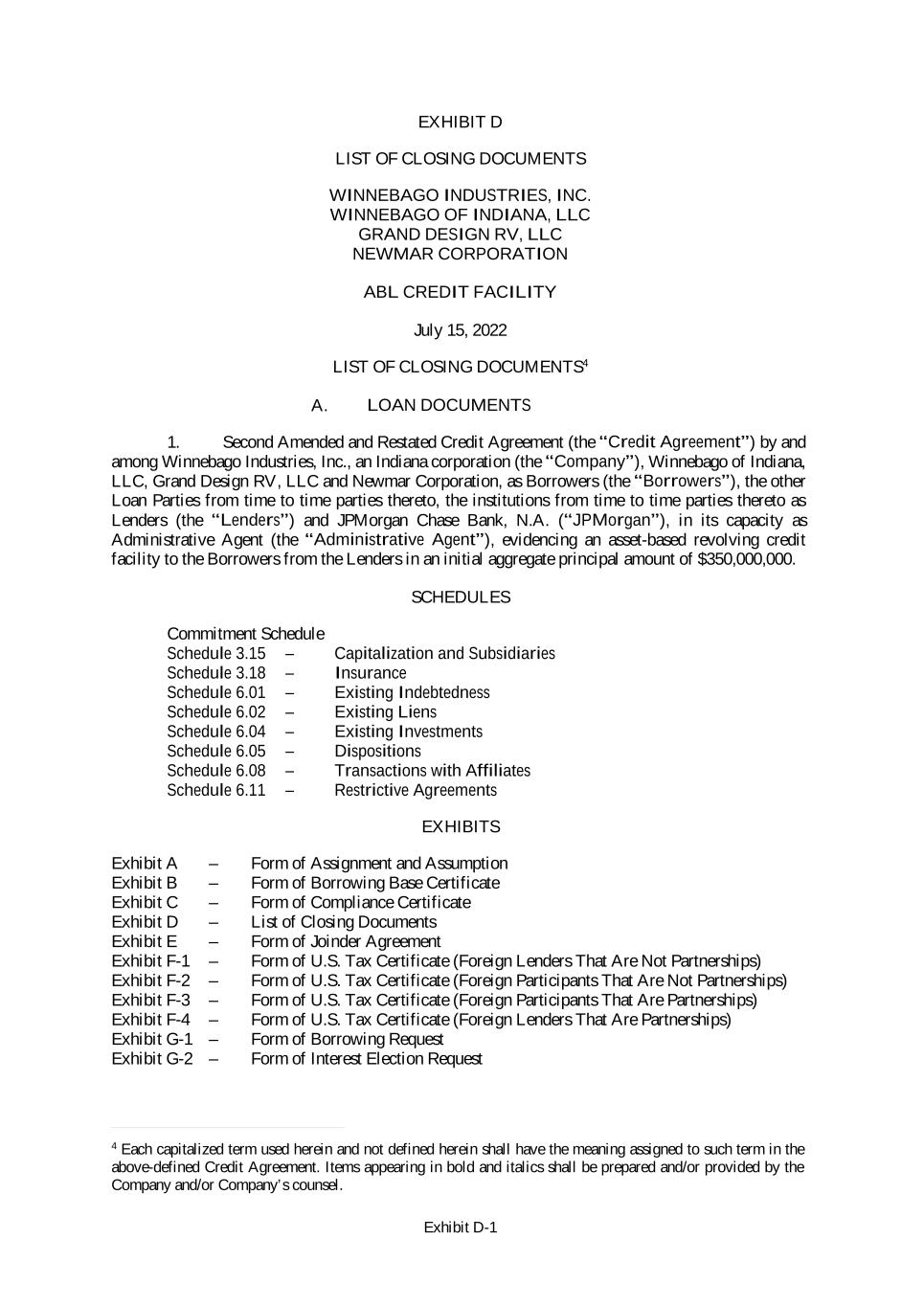 Exhibit D-1 EXHIBIT D LIST OF CLOSING DOCUMENTS WINNEBAGO INDUSTRIES, INC. WINNEBAGO OF INDIANA, LLC GRAND DESIGN RV, LLC NEWMAR CORPORATION ABL CREDIT FACILITY July 15, 2022 LIST OF CLOSING DOCUMENTS4 A. LOAN DOCUMENTS 1. Second Amended and Restated Credit Agreement (the “Credit Agreement”) by and among Winnebago Industries, Inc., an Indiana corporation (the “Company”), Winnebago of Indiana, LLC, Grand Design RV, LLC and Newmar Corporation, as Borrowers (the “Borrowers”), the other Loan Parties from time to time parties thereto, the institutions from time to time parties thereto as Lenders (the “Lenders”) and JPMorgan Chase Bank, N.A. (“JPMorgan”), in its capacity as Administrative Agent (the “Administrative Agent”), evidencing an asset-based revolving credit facility to the Borrowers from the Lenders in an initial aggregate principal amount of $350,000,000. SCHEDULES Commitment Schedule Schedule 3.15 – Capitalization and Subsidiaries Schedule 3.18 – Insurance Schedule 6.01 – Existing Indebtedness Schedule 6.02 – Existing Liens Schedule 6.04 – Existing Investments Schedule 6.05 – Dispositions Schedule 6.08 – Transactions with Affiliates Schedule 6.11 – Restrictive Agreements EXHIBITS Exhibit A – Form of Assignment and Assumption Exhibit B – Form of Borrowing Base Certificate Exhibit C – Form of Compliance Certificate Exhibit D – List of Closing Documents Exhibit E – Form of Joinder Agreement Exhibit F-1 – Form of U.S. Tax Certificate (Foreign Lenders That Are Not Partnerships) Exhibit F-2 – Form of U.S. Tax Certificate (Foreign Participants That Are Not Partnerships) Exhibit F-3 – Form of U.S. Tax Certificate (Foreign Participants That Are Partnerships) Exhibit F-4 – Form of U.S. Tax Certificate (Foreign Lenders That Are Partnerships) Exhibit G-1 – Form of Borrowing Request Exhibit G-2 – Form of Interest Election Request 4 Each capitalized term used herein and not defined herein shall have the meaning assigned to such term in the above-defined Credit Agreement. Items appearing in bold and italics shall be prepared and/or provided by the Company and/or Company’s counsel.