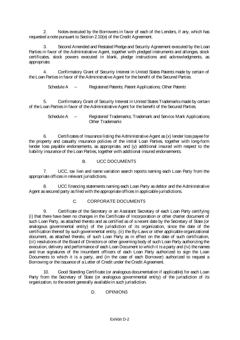 Exhibit D-2 Registered Patents; Patent Applications; Other Patents 5. Confirmatory Grant of Security Interest in United States Trademarks made by certain of the Loan Parties in favor of the Administrative Agent for the benefit of the Secured Parties. Schedule A Schedule A -- Registered Trademarks; Trademark and Service Mark Applications; Other Trademarks -- 6. Certificates of Insurance listing the Administrative Agent as (x) lender loss payee for the property and casualty insurance policies of the initial Loan Parties, together with long-form lender loss payable endorsements, as appropriate, and (y) additional insured with respect to the liability insurance of the Loan Parties, together with additional insured endorsements. B. UCC DOCUMENTS 7. UCC, tax lien and name variation search reports naming each Loan Party from the appropriate offices in relevant jurisdictions. 8. UCC financing statements naming each Loan Party as debtor and the Administrative Agent as secured party as filed with the appropriate offices in applicable jurisdictions. C. CORPORATE DOCUMENTS 9. Certificate of the Secretary or an Assistant Secretary of each Loan Party certifying (i) that there have been no changes in the Certificate of Incorporation or other charter document of such Loan Party, as attached thereto and as certified as of a recent date by the Secretary of State (or analogous governmental entity) of the jurisdiction of its organization, since the date of the certification thereof by such governmental entity, (ii) the By-Laws or other applicable organizational document, as attached thereto, of such Loan Party as in effect on the date of such certification, (iii) resolutions of the Board of Directors or other governing body of such Loan Party authorizing the execution, delivery and performance of each Loan Document to which it is a party and (iv) the names and true signatures of the incumbent officers of each Loan Party authorized to sign the Loan Documents to which it is a party, and (in the case of each Borrower) authorized to request a Borrowing or the issuance of a Letter of Credit under the Credit Agreement. 10. Good Standing Certificate (or analogous documentation if applicable) for each Loan Party from the Secretary of State (or analogous governmental entity) of the jurisdiction of its organization, to the extent generally available in such jurisdiction. D. OPINIONS 2. Notes executed by the Borrowers in favor of each of the Lenders, if any, which has requested a note pursuant to Section 2.10(e) of the Credit Agreement. 3. Second Amended and Restated Pledge and Security Agreement executed by the Loan Parties in favor of the Administrative Agent, together with pledged instruments and allonges, stock certificates, stock powers executed in blank, pledge instructions and acknowledgments, as appropriate. 4. Confirmatory Grant of Security Interest in United States Patents made by certain of the Loan Parties in favor of the Administrative Agent for the benefit of the Secured Parties.