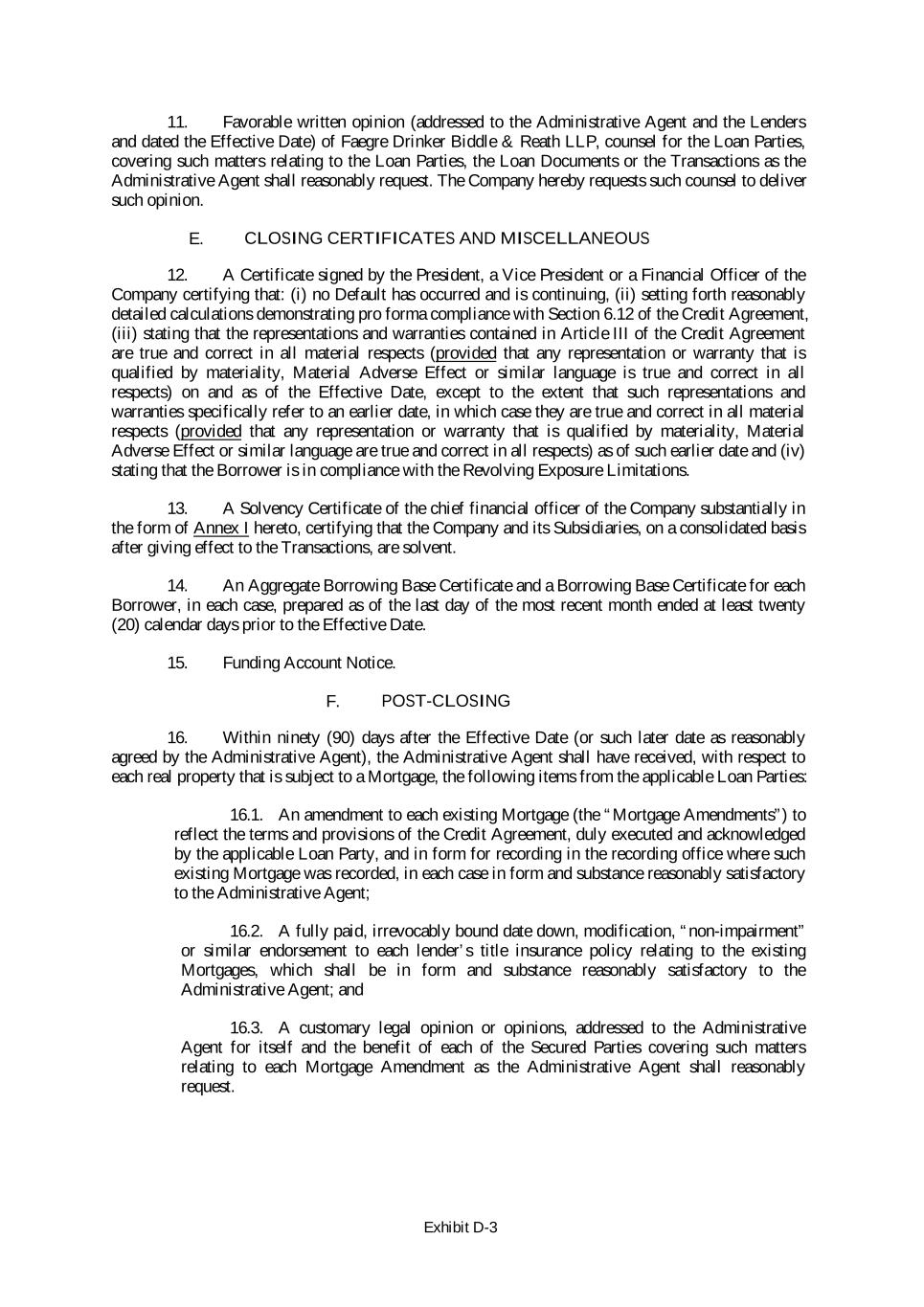 11. Favorable written opinion (addressed to the Administrative Agent and the Lenders and dated the Effective Date) of Faegre Drinker Biddle & Reath LLP, counsel for the Loan Parties, covering such matters relating to the Loan Parties, the Loan Documents or the Transactions as the Administrative Agent shall reasonably request. The Company hereby requests such counsel to deliver such opinion. E. CLOSING CERTIFICATES AND MISCELLANEOUS 12. A Certificate signed by the President, a Vice President or a Financial Officer of the Company certifying that: (i) no Default has occurred and is continuing, (ii) setting forth reasonably detailed calculations demonstrating pro forma compliance with Section 6.12 of the Credit Agreement, (iii) stating that the representations and warranties contained in Article III of the Credit Agreement are true and correct in all material respects (provided that any representation or warranty that is qualified by materiality, Material Adverse Effect or similar language is true and correct in all respects) on and as of the Effective Date, except to the extent that such representations and warranties specifically refer to an earlier date, in which case they are true and correct in all material respects (provided that any representation or warranty that is qualified by materiality, Material Adverse Effect or similar language are true and correct in all respects) as of such earlier date and (iv) stating that the Borrower is in compliance with the Revolving Exposure Limitations. 13. A Solvency Certificate of the chief financial officer of the Company substantially in the form of Annex I hereto, certifying that the Company and its Subsidiaries, on a consolidated basis after giving effect to the Transactions, are solvent. 14. An Aggregate Borrowing Base Certificate and a Borrowing Base Certificate for each Borrower, in each case, prepared as of the last day of the most recent month ended at least twenty (20) calendar days prior to the Effective Date. 15. Funding Account Notice. F. POST-CLOSING 16. Within ninety (90) days after the Effective Date (or such later date as reasonably agreed by the Administrative Agent), the Administrative Agent shall have received, with respect to each real property that is subject to a Mortgage, the following items from the applicable Loan Parties: 16.1. An amendment to each existing Mortgage (the “Mortgage Amendments”) to reflect the terms and provisions of the Credit Agreement, duly executed and acknowledged by the applicable Loan Party, and in form for recording in the recording office where such existing Mortgage was recorded, in each case in form and substance reasonably satisfactory to the Administrative Agent; 16.2. A fully paid, irrevocably bound date down, modification, “non-impairment” or similar endorsement to each lender’s title insurance policy relating to the existing Mortgages, which shall be in form and substance reasonably satisfactory to the Administrative Agent; and 16.3. A customary legal opinion or opinions, addressed to the Administrative Agent for itself and the benefit of each of the Secured Parties covering such matters relating to each Mortgage Amendment as the Administrative Agent shall reasonably request. Exhibit D-3