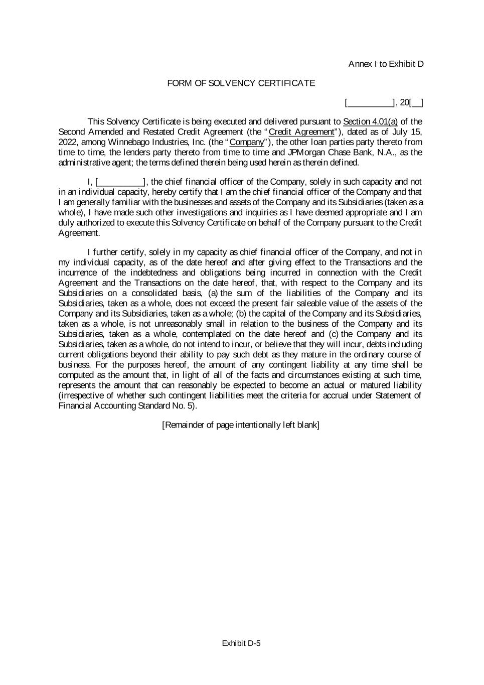 Annex I to Exhibit D FORM OF SOLVENCY CERTIFICATE [__________], 20[__] This Solvency Certificate is being executed and delivered pursuant to Section 4.01(a) of the Second Amended and Restated Credit Agreement (the “Credit Agreement”), dated as of July 15, 2022, among Winnebago Industries, Inc. (the “Company”), the other loan parties party thereto from time to time, the lenders party thereto from time to time and JPMorgan Chase Bank, N.A., as the administrative agent; the terms defined therein being used herein as therein defined. I, [__________], the chief financial officer of the Company, solely in such capacity and not in an individual capacity, hereby certify that I am the chief financial officer of the Company and that I am generally familiar with the businesses and assets of the Company and its Subsidiaries (taken as a whole), I have made such other investigations and inquiries as I have deemed appropriate and I am duly authorized to execute this Solvency Certificate on behalf of the Company pursuant to the Credit Agreement. I further certify, solely in my capacity as chief financial officer of the Company, and not in my individual capacity, as of the date hereof and after giving effect to the Transactions and the incurrence of the indebtedness and obligations being incurred in connection with the Credit Agreement and the Transactions on the date hereof, that, with respect to the Company and its Subsidiaries on a consolidated basis, (a) the sum of the liabilities of the Company and its Subsidiaries, taken as a whole, does not exceed the present fair saleable value of the assets of the Company and its Subsidiaries, taken as a whole; (b) the capital of the Company and its Subsidiaries, taken as a whole, is not unreasonably small in relation to the business of the Company and its Subsidiaries, taken as a whole, contemplated on the date hereof and (c) the Company and its Subsidiaries, taken as a whole, do not intend to incur, or believe that they will incur, debts including current obligations beyond their ability to pay such debt as they mature in the ordinary course of business. For the purposes hereof, the amount of any contingent liability at any time shall be computed as the amount that, in light of all of the facts and circumstances existing at such time, represents the amount that can reasonably be expected to become an actual or matured liability (irrespective of whether such contingent liabilities meet the criteria for accrual under Statement of Financial Accounting Standard No. 5). [Remainder of page intentionally left blank] Exhibit D-5