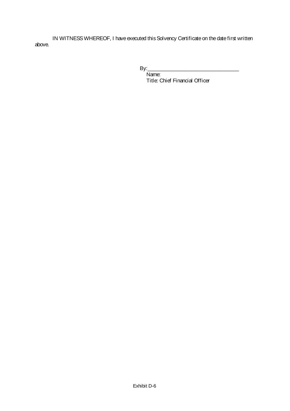 IN WITNESS WHEREOF, I have executed this Solvency Certificate on the date first written above. By:__________________________________ Name: Title: Chief Financial Officer Exhibit D-6