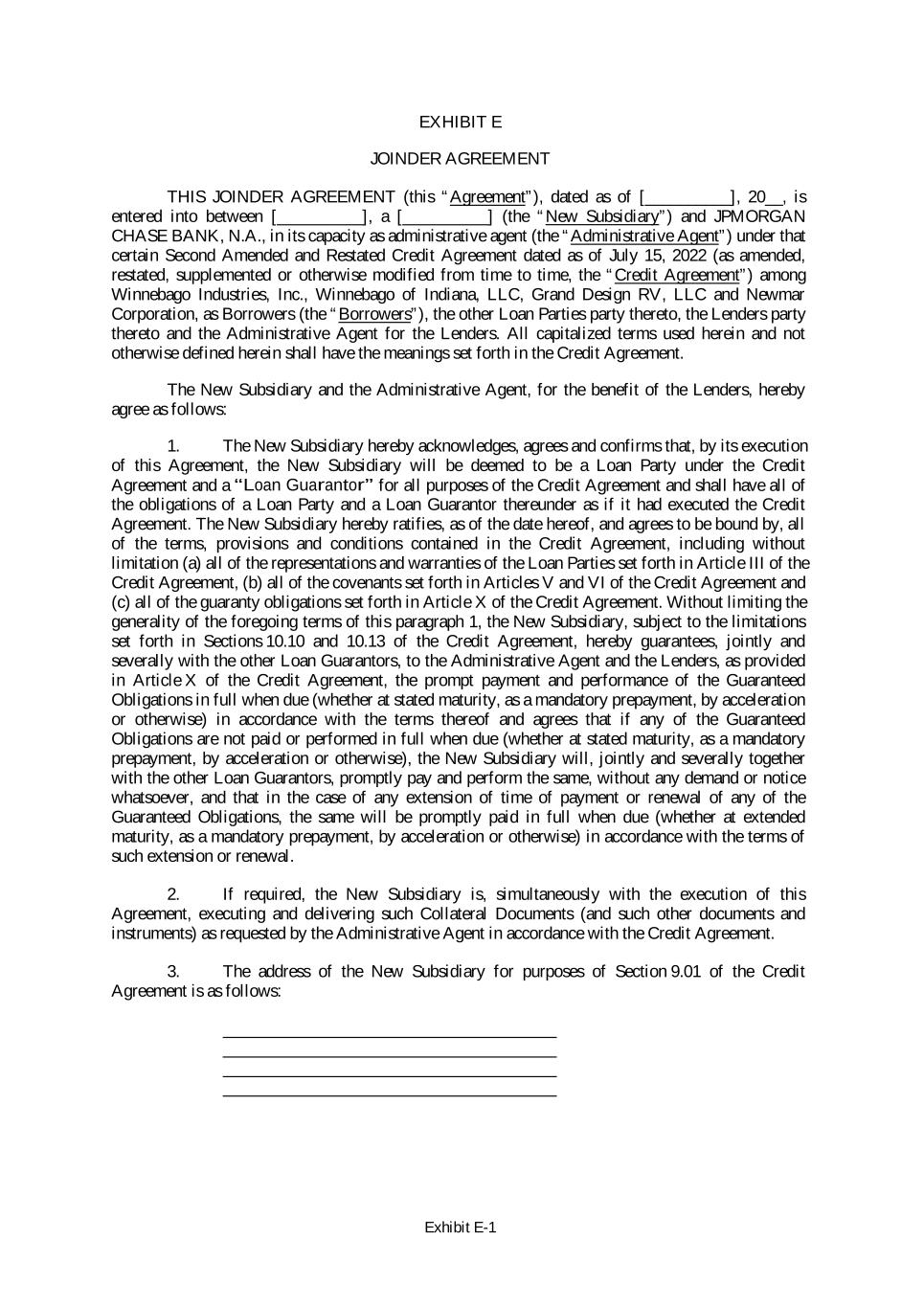 EXHIBIT E JOINDER AGREEMENT THIS JOINDER AGREEMENT (this “Agreement”), dated as of [__________], 20__, is entered into between [__________], a [__________] (the “New Subsidiary”) and JPMORGAN CHASE BANK, N.A., in its capacity as administrative agent (the “Administrative Agent”) under that certain Second Amended and Restated Credit Agreement dated as of July 15, 2022 (as amended, restated, supplemented or otherwise modified from time to time, the “Credit Agreement”) among Winnebago Industries, Inc., Winnebago of Indiana, LLC, Grand Design RV, LLC and Newmar Corporation, as Borrowers (the “Borrowers”), the other Loan Parties party thereto, the Lenders party thereto and the Administrative Agent for the Lenders. All capitalized terms used herein and not otherwise defined herein shall have the meanings set forth in the Credit Agreement. The New Subsidiary and the Administrative Agent, for the benefit of the Lenders, hereby agree as follows: 1. The New Subsidiary hereby acknowledges, agrees and confirms that, by its execution of this Agreement, the New Subsidiary will be deemed to be a Loan Party under the Credit Agreement and a “Loan Guarantor” for all purposes of the Credit Agreement and shall have all of the obligations of a Loan Party and a Loan Guarantor thereunder as if it had executed the Credit Agreement. The New Subsidiary hereby ratifies, as of the date hereof, and agrees to be bound by, all of the terms, provisions and conditions contained in the Credit Agreement, including without limitation (a) all of the representations and warranties of the Loan Parties set forth in Article III of the Credit Agreement, (b) all of the covenants set forth in Articles V and VI of the Credit Agreement and (c) all of the guaranty obligations set forth in Article X of the Credit Agreement. Without limiting the generality of the foregoing terms of this paragraph 1, the New Subsidiary, subject to the limitations set forth in Sections 10.10 and 10.13 of the Credit Agreement, hereby guarantees, jointly and severally with the other Loan Guarantors, to the Administrative Agent and the Lenders, as provided in Article X of the Credit Agreement, the prompt payment and performance of the Guaranteed Obligations in full when due (whether at stated maturity, as a mandatory prepayment, by acceleration or otherwise) in accordance with the terms thereof and agrees that if any of the Guaranteed Obligations are not paid or performed in full when due (whether at stated maturity, as a mandatory prepayment, by acceleration or otherwise), the New Subsidiary will, jointly and severally together with the other Loan Guarantors, promptly pay and perform the same, without any demand or notice whatsoever, and that in the case of any extension of time of payment or renewal of any of the Guaranteed Obligations, the same will be promptly paid in full when due (whether at extended maturity, as a mandatory prepayment, by acceleration or otherwise) in accordance with the terms of such extension or renewal. 2. If required, the New Subsidiary is, simultaneously with the execution of this Agreement, executing and delivering such Collateral Documents (and such other documents and instruments) as requested by the Administrative Agent in accordance with the Credit Agreement. 3. The address of the New Subsidiary for purposes of Section 9.01 of the Credit Agreement is as follows: Exhibit E-1