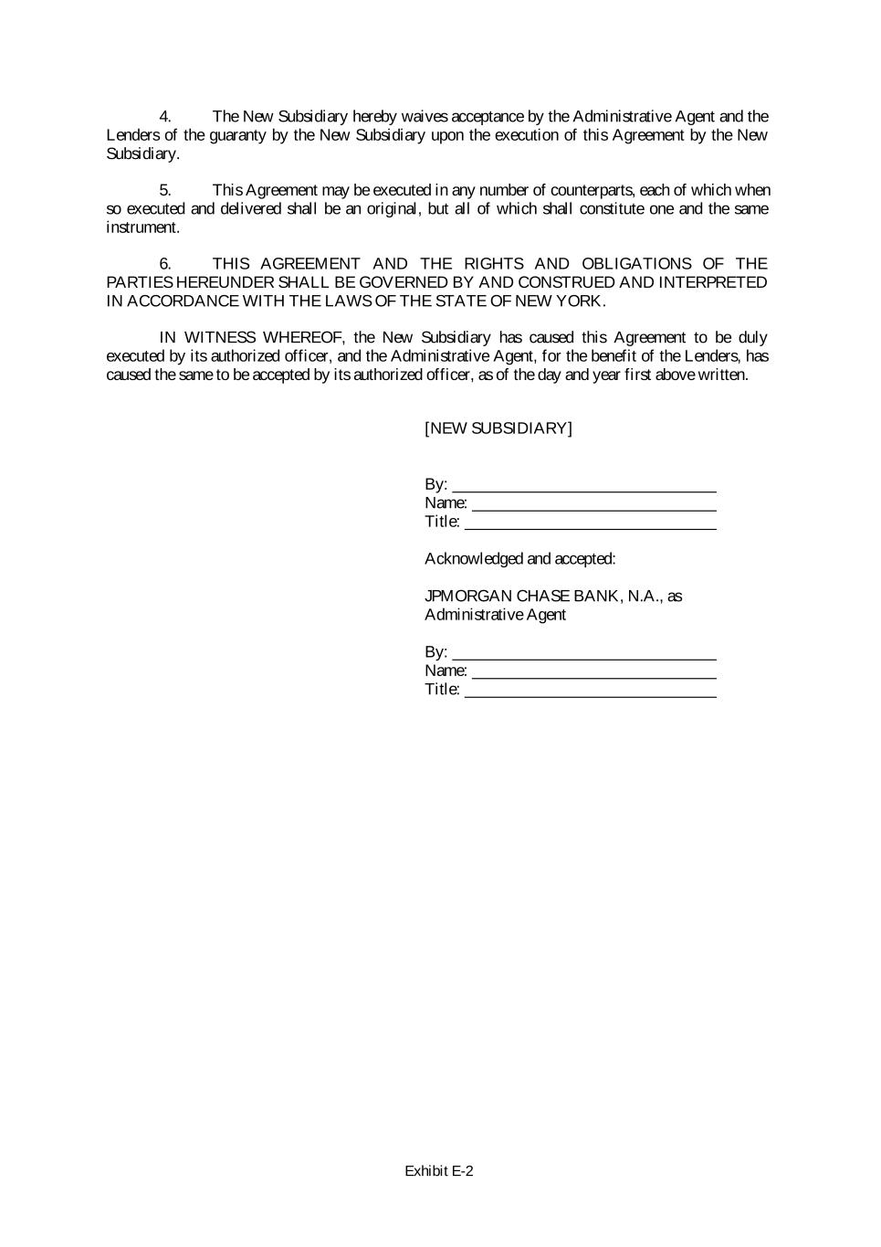 4. The New Subsidiary hereby waives acceptance by the Administrative Agent and the Lenders of the guaranty by the New Subsidiary upon the execution of this Agreement by the New Subsidiary. 5. This Agreement may be executed in any number of counterparts, each of which when so executed and delivered shall be an original, but all of which shall constitute one and the same instrument. 6. THIS AGREEMENT AND THE RIGHTS AND OBLIGATIONS OF THE PARTIES HEREUNDER SHALL BE GOVERNED BY AND CONSTRUED AND INTERPRETED IN ACCORDANCE WITH THE LAWS OF THE STATE OF NEW YORK. IN WITNESS WHEREOF, the New Subsidiary has caused this Agreement to be duly executed by its authorized officer, and the Administrative Agent, for the benefit of the Lenders, has caused the same to be accepted by its authorized officer, as of the day and year first above written. [NEW SUBSIDIARY] By: Name: Title: Acknowledged and accepted: JPMORGAN CHASE BANK, N.A., as Administrative Agent By: Name: Title: Exhibit E-2