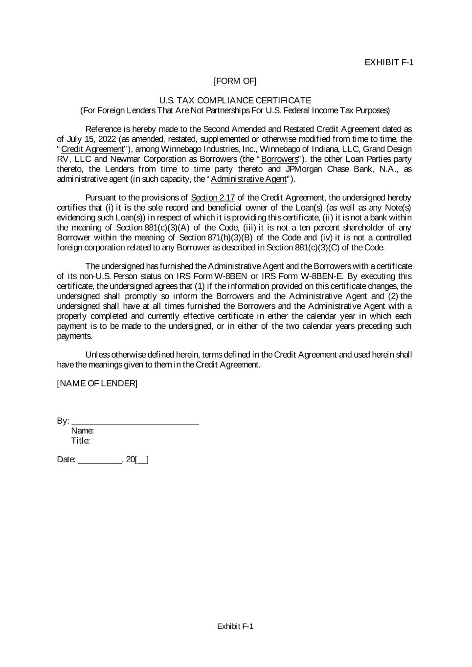 EXHIBIT F-1 [FORM OF] U.S. TAX COMPLIANCE CERTIFICATE (For Foreign Lenders That Are Not Partnerships For U.S. Federal Income Tax Purposes) Reference is hereby made to the Second Amended and Restated Credit Agreement dated as of July 15, 2022 (as amended, restated, supplemented or otherwise modified from time to time, the “Credit Agreement”), among Winnebago Industries, Inc., Winnebago of Indiana, LLC, Grand Design RV, LLC and Newmar Corporation as Borrowers (the “Borrowers”), the other Loan Parties party thereto, the Lenders from time to time party thereto and JPMorgan Chase Bank, N.A., as administrative agent (in such capacity, the “Administrative Agent”). Pursuant to the provisions of Section 2.17 of the Credit Agreement, the undersigned hereby certifies that (i) it is the sole record and beneficial owner of the Loan(s) (as well as any Note(s) evidencing such Loan(s)) in respect of which it is providing this certificate, (ii) it is not a bank within the meaning of Section 881(c)(3)(A) of the Code, (iii) it is not a ten percent shareholder of any Borrower within the meaning of Section 871(h)(3)(B) of the Code and (iv) it is not a controlled foreign corporation related to any Borrower as described in Section 881(c)(3)(C) of the Code. The undersigned has furnished the Administrative Agent and the Borrowers with a certificate of its non-U.S. Person status on IRS Form W-8BEN or IRS Form W-8BEN-E. By executing this certificate, the undersigned agrees that (1) if the information provided on this certificate changes, the undersigned shall promptly so inform the Borrowers and the Administrative Agent and (2) the undersigned shall have at all times furnished the Borrowers and the Administrative Agent with a properly completed and currently effective certificate in either the calendar year in which each payment is to be made to the undersigned, or in either of the two calendar years preceding such payments. Unless otherwise defined herein, terms defined in the Credit Agreement and used herein shall have the meanings given to them in the Credit Agreement. [NAME OF LENDER] By: Name: Title: Date: __________, 20[__] Exhibit F-1