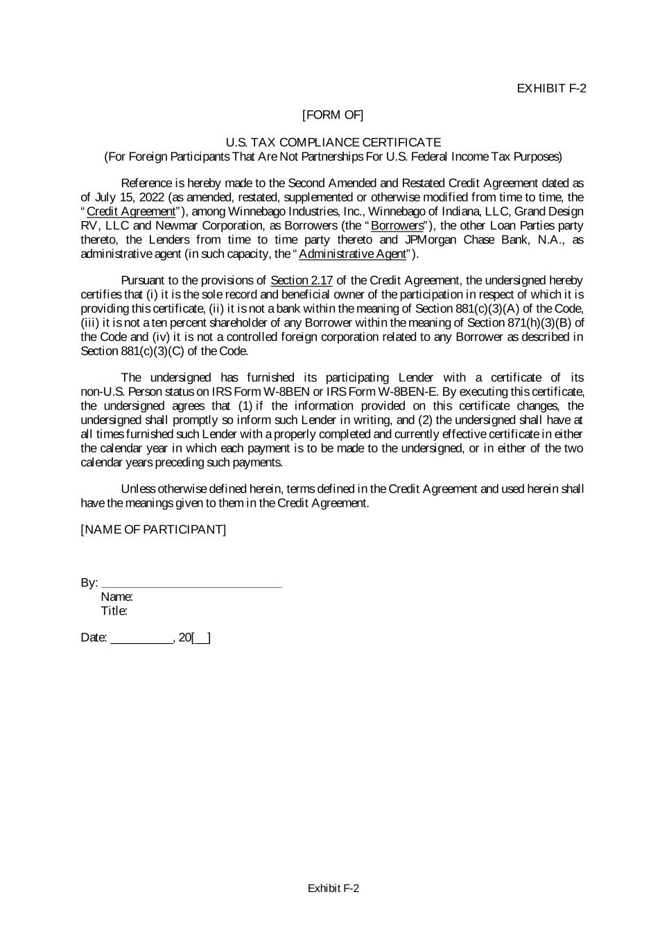 EXHIBIT F-2 [FORM OF] U.S. TAX COMPLIANCE CERTIFICATE (For Foreign Participants That Are Not Partnerships For U.S. Federal Income Tax Purposes) Reference is hereby made to the Second Amended and Restated Credit Agreement dated as of July 15, 2022 (as amended, restated, supplemented or otherwise modified from time to time, the “Credit Agreement”), among Winnebago Industries, Inc., Winnebago of Indiana, LLC, Grand Design RV, LLC and Newmar Corporation, as Borrowers (the “Borrowers”), the other Loan Parties party thereto, the Lenders from time to time party thereto and JPMorgan Chase Bank, N.A., as administrative agent (in such capacity, the “Administrative Agent”). Pursuant to the provisions of Section 2.17 of the Credit Agreement, the undersigned hereby certifies that (i) it is the sole record and beneficial owner of the participation in respect of which it is providing this certificate, (ii) it is not a bank within the meaning of Section 881(c)(3)(A) of the Code, (iii) it is not a ten percent shareholder of any Borrower within the meaning of Section 871(h)(3)(B) of the Code and (iv) it is not a controlled foreign corporation related to any Borrower as described in Section 881(c)(3)(C) of the Code. The undersigned has furnished its participating Lender with a certificate of its non-U.S. Person status on IRS Form W-8BEN or IRS Form W-8BEN-E. By executing this certificate, the undersigned agrees that (1) if the information provided on this certificate changes, the undersigned shall promptly so inform such Lender in writing, and (2) the undersigned shall have at all times furnished such Lender with a properly completed and currently effective certificate in either the calendar year in which each payment is to be made to the undersigned, or in either of the two calendar years preceding such payments. Unless otherwise defined herein, terms defined in the Credit Agreement and used herein shall have the meanings given to them in the Credit Agreement. [NAME OF PARTICIPANT] By: Name: Title: Date: __________, 20[__] Exhibit F-2