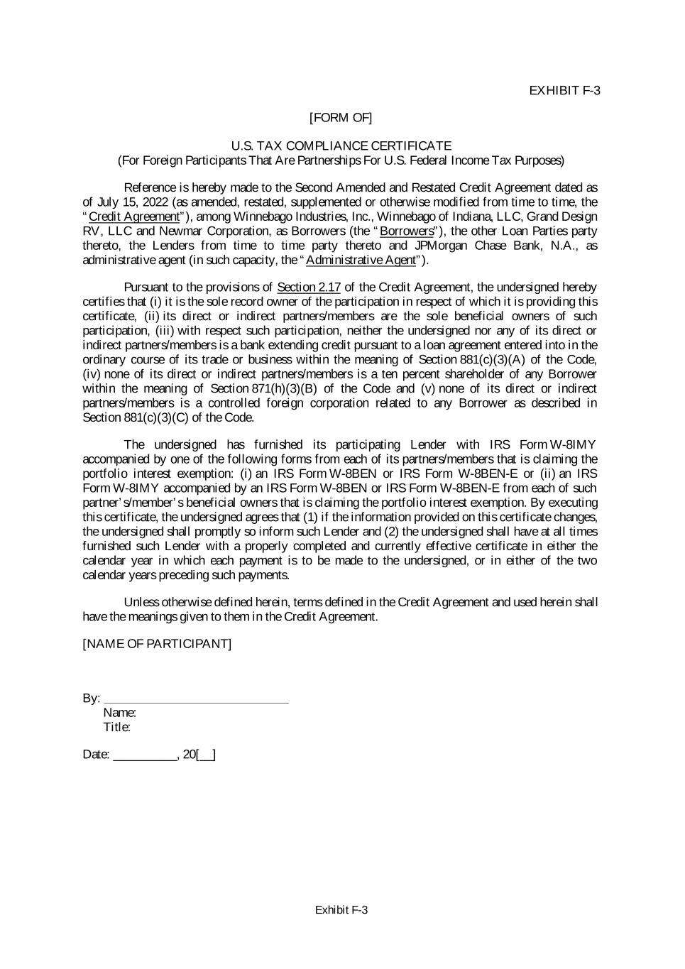 EXHIBIT F-3 [FORM OF] U.S. TAX COMPLIANCE CERTIFICATE (For Foreign Participants That Are Partnerships For U.S. Federal Income Tax Purposes) Reference is hereby made to the Second Amended and Restated Credit Agreement dated as of July 15, 2022 (as amended, restated, supplemented or otherwise modified from time to time, the “Credit Agreement”), among Winnebago Industries, Inc., Winnebago of Indiana, LLC, Grand Design RV, LLC and Newmar Corporation, as Borrowers (the “Borrowers”), the other Loan Parties party thereto, the Lenders from time to time party thereto and JPMorgan Chase Bank, N.A., as administrative agent (in such capacity, the “Administrative Agent”). Pursuant to the provisions of Section 2.17 of the Credit Agreement, the undersigned hereby certifies that (i) it is the sole record owner of the participation in respect of which it is providing this certificate, (ii) its direct or indirect partners/members are the sole beneficial owners of such participation, (iii) with respect such participation, neither the undersigned nor any of its direct or indirect partners/members is a bank extending credit pursuant to a loan agreement entered into in the ordinary course of its trade or business within the meaning of Section 881(c)(3)(A) of the Code, (iv) none of its direct or indirect partners/members is a ten percent shareholder of any Borrower within the meaning of Section 871(h)(3)(B) of the Code and (v) none of its direct or indirect partners/members is a controlled foreign corporation related to any Borrower as described in Section 881(c)(3)(C) of the Code. The undersigned has furnished its participating Lender with IRS Form W-8IMY accompanied by one of the following forms from each of its partners/members that is claiming the portfolio interest exemption: (i) an IRS Form W-8BEN or IRS Form W-8BEN-E or (ii) an IRS Form W-8IMY accompanied by an IRS Form W-8BEN or IRS Form W-8BEN-E from each of such partner’s/member’s beneficial owners that is claiming the portfolio interest exemption. By executing this certificate, the undersigned agrees that (1) if the information provided on this certificate changes, the undersigned shall promptly so inform such Lender and (2) the undersigned shall have at all times furnished such Lender with a properly completed and currently effective certificate in either the calendar year in which each payment is to be made to the undersigned, or in either of the two calendar years preceding such payments. Unless otherwise defined herein, terms defined in the Credit Agreement and used herein shall have the meanings given to them in the Credit Agreement. [NAME OF PARTICIPANT] By: Name: Title: Date: __________, 20[__] Exhibit F-3