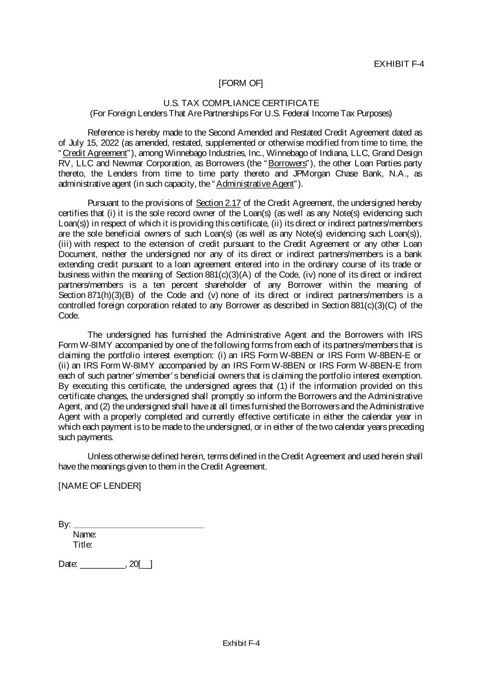 EXHIBIT F-4 [FORM OF] U.S. TAX COMPLIANCE CERTIFICATE (For Foreign Lenders That Are Partnerships For U.S. Federal Income Tax Purposes) Reference is hereby made to the Second Amended and Restated Credit Agreement dated as of July 15, 2022 (as amended, restated, supplemented or otherwise modified from time to time, the “Credit Agreement”), among Winnebago Industries, Inc., Winnebago of Indiana, LLC, Grand Design RV, LLC and Newmar Corporation, as Borrowers (the “Borrowers”), the other Loan Parties party thereto, the Lenders from time to time party thereto and JPMorgan Chase Bank, N.A., as administrative agent (in such capacity, the “Administrative Agent”). Pursuant to the provisions of Section 2.17 of the Credit Agreement, the undersigned hereby certifies that (i) it is the sole record owner of the Loan(s) (as well as any Note(s) evidencing such Loan(s)) in respect of which it is providing this certificate, (ii) its direct or indirect partners/members are the sole beneficial owners of such Loan(s) (as well as any Note(s) evidencing such Loan(s)), (iii) with respect to the extension of credit pursuant to the Credit Agreement or any other Loan Document, neither the undersigned nor any of its direct or indirect partners/members is a bank extending credit pursuant to a loan agreement entered into in the ordinary course of its trade or business within the meaning of Section 881(c)(3)(A) of the Code, (iv) none of its direct or indirect partners/members is a ten percent shareholder of any Borrower within the meaning of Section 871(h)(3)(B) of the Code and (v) none of its direct or indirect partners/members is a controlled foreign corporation related to any Borrower as described in Section 881(c)(3)(C) of the Code. The undersigned has furnished the Administrative Agent and the Borrowers with IRS Form W-8IMY accompanied by one of the following forms from each of its partners/members that is claiming the portfolio interest exemption: (i) an IRS Form W-8BEN or IRS Form W-8BEN-E or (ii) an IRS Form W-8IMY accompanied by an IRS Form W-8BEN or IRS Form W-8BEN-E from each of such partner’s/member’s beneficial owners that is claiming the portfolio interest exemption. By executing this certificate, the undersigned agrees that (1) if the information provided on this certificate changes, the undersigned shall promptly so inform the Borrowers and the Administrative Agent, and (2) the undersigned shall have at all times furnished the Borrowers and the Administrative Agent with a properly completed and currently effective certificate in either the calendar year in which each payment is to be made to the undersigned, or in either of the two calendar years preceding such payments. Unless otherwise defined herein, terms defined in the Credit Agreement and used herein shall have the meanings given to them in the Credit Agreement. [NAME OF LENDER] By: Name: Title: Date: __________, 20[__] Exhibit F-4