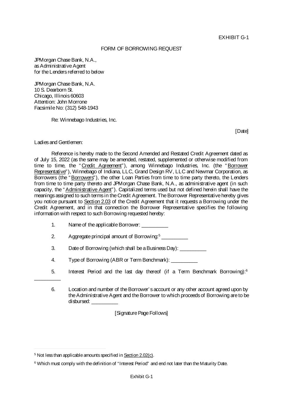 Exhibit G-1 2. Aggregate principal amount of Borrowing:5 __________ 3. Date of Borrowing (which shall be a Business Day): __________ 4. Type of Borrowing (ABR or Term Benchmark): __________ 5. Interest Period and the last day thereof (if a Term Benchmark Borrowing):6 __________ 6. Location and number of the Borrower’s account or any other account agreed upon by the Administrative Agent and the Borrower to which proceeds of Borrowing are to be disbursed: __________ [Signature Page Follows] EXHIBIT G-1 FORM OF BORROWING REQUEST JPMorgan Chase Bank, N.A., as Administrative Agent for the Lenders referred to below JPMorgan Chase Bank, N.A. 10 S. Dearborn St. Chicago, Illinois 60603 Attention: John Morrone Facsimile No: (312) 548-1943 Re: Winnebago Industries, Inc. [Date] Ladies and Gentlemen: Reference is hereby made to the Second Amended and Restated Credit Agreement dated as of July 15, 2022 (as the same may be amended, restated, supplemented or otherwise modified from time to time, the “Credit Agreement”), among Winnebago Industries, Inc. (the “Borrower Representative”), Winnebago of Indiana, LLC, Grand Design RV, LLC and Newmar Corporation, as Borrowers (the “Borrowers”), the other Loan Parties from time to time party thereto, the Lenders from time to time party thereto and JPMorgan Chase Bank, N.A., as administrative agent (in such capacity, the “Administrative Agent”). Capitalized terms used but not defined herein shall have the meanings assigned to such terms in the Credit Agreement. The Borrower Representative hereby gives you notice pursuant to Section 2.03 of the Credit Agreement that it requests a Borrowing under the Credit Agreement, and in that connection the Borrower Representative specifies the following information with respect to such Borrowing requested hereby: 1. Name of the applicable Borrower: __________ 5 Not less than applicable amounts specified in Section 2.02(c). 6 Which must comply with the definition of “Interest Period” and end not later than the Maturity Date.