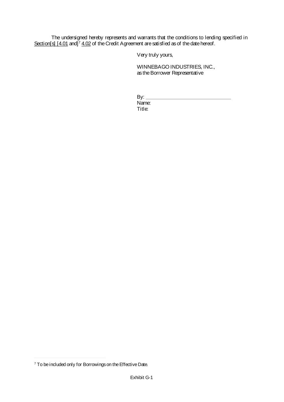 Exhibit G-1 The undersigned hereby represents and warrants that the conditions to lending specified in Section[s] [4.01 and]7 4.02 of the Credit Agreement are satisfied as of the date hereof. Very truly yours, WINNEBAGO INDUSTRIES, INC., as the Borrower Representative By: Name: Title: 7 To be included only for Borrowings on the Effective Date.