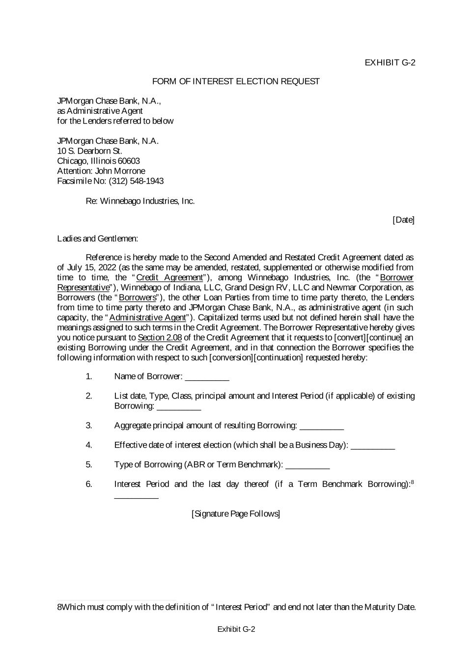 Exhibit G-2 EXHIBIT G-2 FORM OF INTEREST ELECTION REQUEST JPMorgan Chase Bank, N.A., as Administrative Agent for the Lenders referred to below JPMorgan Chase Bank, N.A. 10 S. Dearborn St. Chicago, Illinois 60603 Attention: John Morrone Facsimile No: (312) 548-1943 Re: Winnebago Industries, Inc. [Date] Ladies and Gentlemen: Reference is hereby made to the Second Amended and Restated Credit Agreement dated as of July 15, 2022 (as the same may be amended, restated, supplemented or otherwise modified from time to time, the “Credit Agreement”), among Winnebago Industries, Inc. (the “Borrower Representative”), Winnebago of Indiana, LLC, Grand Design RV, LLC and Newmar Corporation, as Borrowers (the “Borrowers”), the other Loan Parties from time to time party thereto, the Lenders from time to time party thereto and JPMorgan Chase Bank, N.A., as administrative agent (in such capacity, the “Administrative Agent”). Capitalized terms used but not defined herein shall have the meanings assigned to such terms in the Credit Agreement. The Borrower Representative hereby gives you notice pursuant to Section 2.08 of the Credit Agreement that it requests to [convert][continue] an existing Borrowing under the Credit Agreement, and in that connection the Borrower specifies the following information with respect to such [conversion][continuation] requested hereby: 1. Name of Borrower: __________ 2. List date, Type, Class, principal amount and Interest Period (if applicable) of existing Borrowing: __________ 3. Aggregate principal amount of resulting Borrowing: __________ 4. Effective date of interest election (which shall be a Business Day): __________ 5. Type of Borrowing (ABR or Term Benchmark): __________ 6. Interest Period and the last day thereof (if a Term Benchmark Borrowing):8 __________ [Signature Page Follows] 8Which must comply with the definition of “Interest Period” and end not later than the Maturity Date.