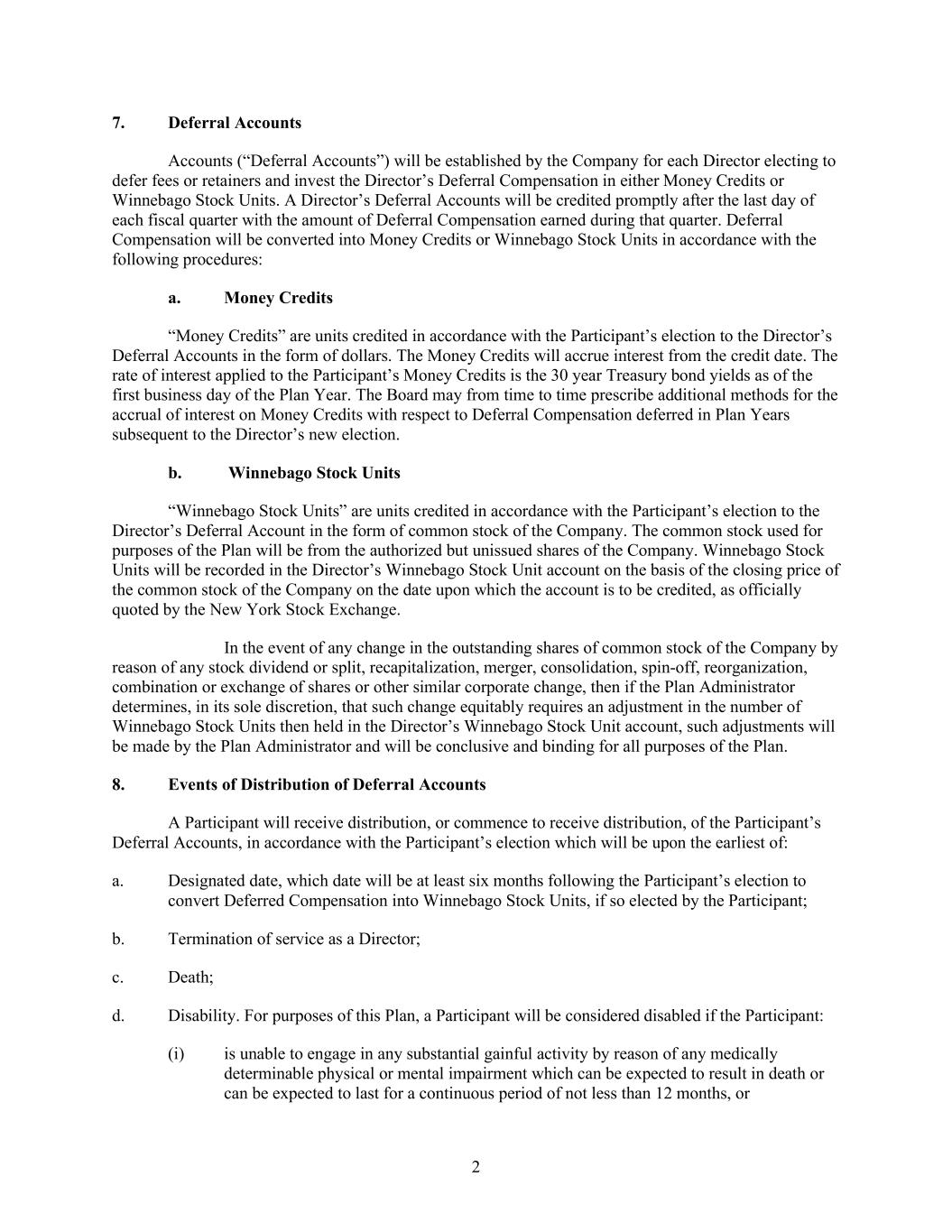 2 7. Deferral Accounts Accounts (“Deferral Accounts”) will be established by the Company for each Director electing to defer fees or retainers and invest the Director’s Deferral Compensation in either Money Credits or Winnebago Stock Units. A Director’s Deferral Accounts will be credited promptly after the last day of each fiscal quarter with the amount of Deferral Compensation earned during that quarter. Deferral Compensation will be converted into Money Credits or Winnebago Stock Units in accordance with the following procedures: a. Money Credits “Money Credits” are units credited in accordance with the Participant’s election to the Director’s Deferral Accounts in the form of dollars. The Money Credits will accrue interest from the credit date. The rate of interest applied to the Participant’s Money Credits is the 30 year Treasury bond yields as of the first business day of the Plan Year. The Board may from time to time prescribe additional methods for the accrual of interest on Money Credits with respect to Deferral Compensation deferred in Plan Years subsequent to the Director’s new election. b. Winnebago Stock Units “Winnebago Stock Units” are units credited in accordance with the Participant’s election to the Director’s Deferral Account in the form of common stock of the Company. The common stock used for purposes of the Plan will be from the authorized but unissued shares of the Company. Winnebago Stock Units will be recorded in the Director’s Winnebago Stock Unit account on the basis of the closing price of the common stock of the Company on the date upon which the account is to be credited, as officially quoted by the New York Stock Exchange. In the event of any change in the outstanding shares of common stock of the Company by reason of any stock dividend or split, recapitalization, merger, consolidation, spin-off, reorganization, combination or exchange of shares or other similar corporate change, then if the Plan Administrator determines, in its sole discretion, that such change equitably requires an adjustment in the number of Winnebago Stock Units then held in the Director’s Winnebago Stock Unit account, such adjustments will be made by the Plan Administrator and will be conclusive and binding for all purposes of the Plan. 8. Events of Distribution of Deferral Accounts A Participant will receive distribution, or commence to receive distribution, of the Participant’s Deferral Accounts, in accordance with the Participant’s election which will be upon the earliest of: a. Designated date, which date will be at least six months following the Participant’s election to convert Deferred Compensation into Winnebago Stock Units, if so elected by the Participant; b. Termination of service as a Director; c. Death; d. Disability. For purposes of this Plan, a Participant will be considered disabled if the Participant: (i) is unable to engage in any substantial gainful activity by reason of any medically determinable physical or mental impairment which can be expected to result in death or can be expected to last for a continuous period of not less than 12 months, or