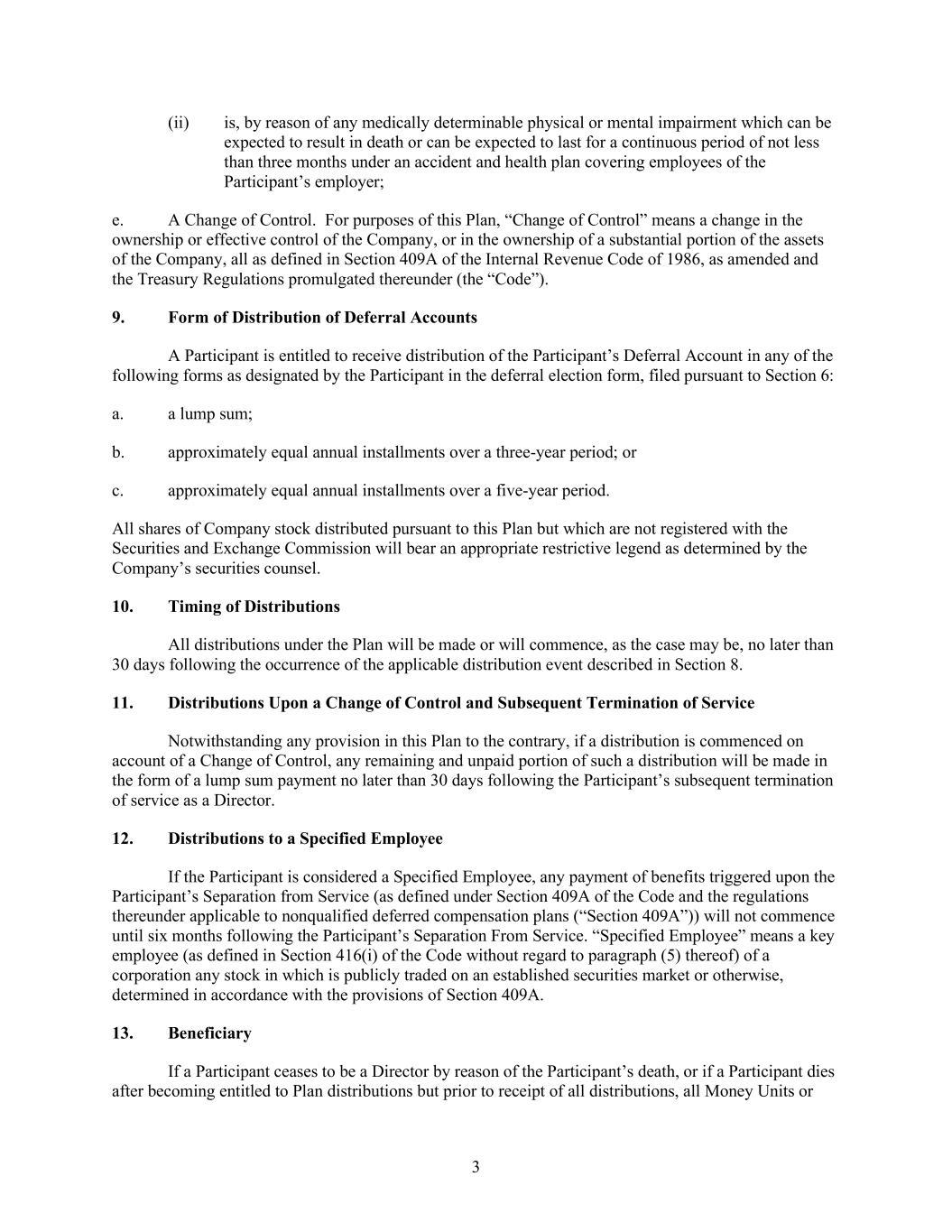 3 (ii) is, by reason of any medically determinable physical or mental impairment which can be expected to result in death or can be expected to last for a continuous period of not less than three months under an accident and health plan covering employees of the Participant’s employer; e. A Change of Control. For purposes of this Plan, “Change of Control” means a change in the ownership or effective control of the Company, or in the ownership of a substantial portion of the assets of the Company, all as defined in Section 409A of the Internal Revenue Code of 1986, as amended and the Treasury Regulations promulgated thereunder (the “Code”). 9. Form of Distribution of Deferral Accounts A Participant is entitled to receive distribution of the Participant’s Deferral Account in any of the following forms as designated by the Participant in the deferral election form, filed pursuant to Section 6: a. a lump sum; b. approximately equal annual installments over a three-year period; or c. approximately equal annual installments over a five-year period. All shares of Company stock distributed pursuant to this Plan but which are not registered with the Securities and Exchange Commission will bear an appropriate restrictive legend as determined by the Company’s securities counsel. 10. Timing of Distributions All distributions under the Plan will be made or will commence, as the case may be, no later than 30 days following the occurrence of the applicable distribution event described in Section 8. 11. Distributions Upon a Change of Control and Subsequent Termination of Service Notwithstanding any provision in this Plan to the contrary, if a distribution is commenced on account of a Change of Control, any remaining and unpaid portion of such a distribution will be made in the form of a lump sum payment no later than 30 days following the Participant’s subsequent termination of service as a Director. 12. Distributions to a Specified Employee If the Participant is considered a Specified Employee, any payment of benefits triggered upon the Participant’s Separation from Service (as defined under Section 409A of the Code and the regulations thereunder applicable to nonqualified deferred compensation plans (“Section 409A”)) will not commence until six months following the Participant’s Separation From Service. “Specified Employee” means a key employee (as defined in Section 416(i) of the Code without regard to paragraph (5) thereof) of a corporation any stock in which is publicly traded on an established securities market or otherwise, determined in accordance with the provisions of Section 409A. 13. Beneficiary If a Participant ceases to be a Director by reason of the Participant’s death, or if a Participant dies after becoming entitled to Plan distributions but prior to receipt of all distributions, all Money Units or
