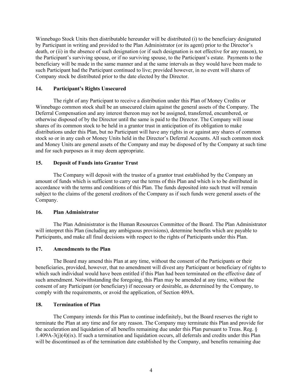 4 Winnebago Stock Units then distributable hereunder will be distributed (i) to the beneficiary designated by Participant in writing and provided to the Plan Administrator (or its agent) prior to the Director’s death, or (ii) in the absence of such designation (or if such designation is not effective for any reason), to the Participant’s surviving spouse, or if no surviving spouse, to the Participant’s estate. Payments to the beneficiary will be made in the same manner and at the same intervals as they would have been made to such Participant had the Participant continued to live; provided however, in no event will shares of Company stock be distributed prior to the date elected by the Director. 14. Participant’s Rights Unsecured The right of any Participant to receive a distribution under this Plan of Money Credits or Winnebago common stock shall be an unsecured claim against the general assets of the Company. The Deferral Compensation and any interest thereon may not be assigned, transferred, encumbered, or otherwise disposed of by the Director until the same is paid to the Director. The Company will issue shares of its common stock to be held in a grantor trust in anticipation of its obligation to make distributions under this Plan, but no Participant will have any rights in or against any shares of common stock so or in any cash or Money Units held in the Director’s Deferral Accounts. All such common stock and Money Units are general assets of the Company and may be disposed of by the Company at such time and for such purposes as it may deem appropriate. 15. Deposit of Funds into Grantor Trust The Company will deposit with the trustee of a grantor trust established by the Company an amount of funds which is sufficient to carry out the terms of this Plan and which is to be distributed in accordance with the terms and conditions of this Plan. The funds deposited into such trust will remain subject to the claims of the general creditors of the Company as if such funds were general assets of the Company. 16. Plan Administrator The Plan Administrator is the Human Resources Committee of the Board. The Plan Administrator will interpret this Plan (including any ambiguous provisions), determine benefits which are payable to Participants, and make all final decisions with respect to the rights of Participants under this Plan. 17. Amendments to the Plan The Board may amend this Plan at any time, without the consent of the Participants or their beneficiaries, provided, however, that no amendment will divest any Participant or beneficiary of rights to which such individual would have been entitled if this Plan had been terminated on the effective date of such amendment. Notwithstanding the foregoing, this Plan may be amended at any time, without the consent of any Participant (or beneficiary) if necessary or desirable, as determined by the Company, to comply with the requirements, or avoid the application, of Section 409A. 18. Termination of Plan The Company intends for this Plan to continue indefinitely, but the Board reserves the right to terminate the Plan at any time and for any reason. The Company may terminate this Plan and provide for the acceleration and liquidation of all benefits remaining due under this Plan pursuant to Treas. Reg. § 1.409A-3(j)(4)(ix). If such a termination and liquidation occurs, all deferrals and credits under this Plan will be discontinued as of the termination date established by the Company, and benefits remaining due