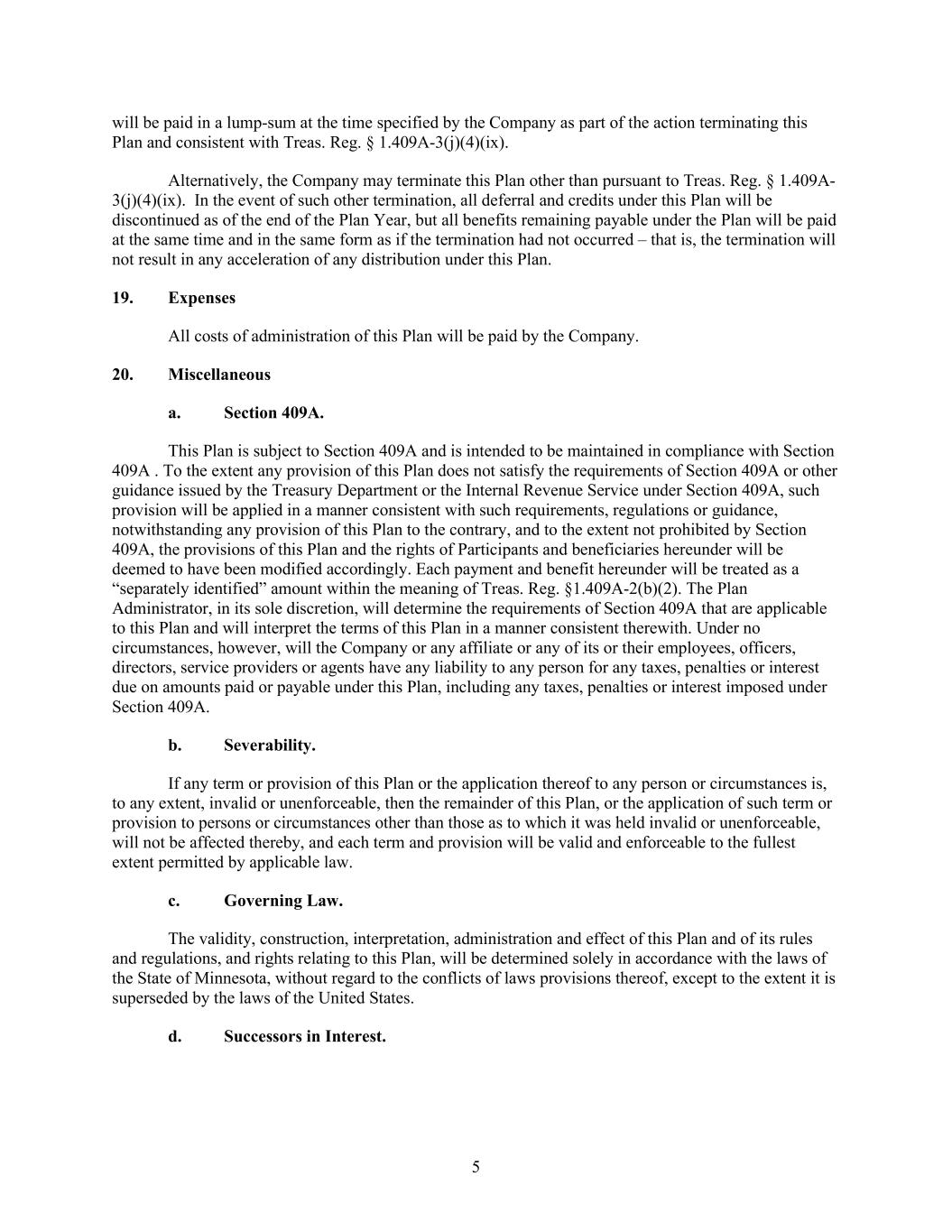 5 will be paid in a lump-sum at the time specified by the Company as part of the action terminating this Plan and consistent with Treas. Reg. § 1.409A-3(j)(4)(ix). Alternatively, the Company may terminate this Plan other than pursuant to Treas. Reg. § 1.409A- 3(j)(4)(ix). In the event of such other termination, all deferral and credits under this Plan will be discontinued as of the end of the Plan Year, but all benefits remaining payable under the Plan will be paid at the same time and in the same form as if the termination had not occurred – that is, the termination will not result in any acceleration of any distribution under this Plan. 19. Expenses All costs of administration of this Plan will be paid by the Company. 20. Miscellaneous a. Section 409A. This Plan is subject to Section 409A and is intended to be maintained in compliance with Section 409A . To the extent any provision of this Plan does not satisfy the requirements of Section 409A or other guidance issued by the Treasury Department or the Internal Revenue Service under Section 409A, such provision will be applied in a manner consistent with such requirements, regulations or guidance, notwithstanding any provision of this Plan to the contrary, and to the extent not prohibited by Section 409A, the provisions of this Plan and the rights of Participants and beneficiaries hereunder will be deemed to have been modified accordingly. Each payment and benefit hereunder will be treated as a “separately identified” amount within the meaning of Treas. Reg. §1.409A-2(b)(2). The Plan Administrator, in its sole discretion, will determine the requirements of Section 409A that are applicable to this Plan and will interpret the terms of this Plan in a manner consistent therewith. Under no circumstances, however, will the Company or any affiliate or any of its or their employees, officers, directors, service providers or agents have any liability to any person for any taxes, penalties or interest due on amounts paid or payable under this Plan, including any taxes, penalties or interest imposed under Section 409A. b. Severability. If any term or provision of this Plan or the application thereof to any person or circumstances is, to any extent, invalid or unenforceable, then the remainder of this Plan, or the application of such term or provision to persons or circumstances other than those as to which it was held invalid or unenforceable, will not be affected thereby, and each term and provision will be valid and enforceable to the fullest extent permitted by applicable law. c. Governing Law. The validity, construction, interpretation, administration and effect of this Plan and of its rules and regulations, and rights relating to this Plan, will be determined solely in accordance with the laws of the State of Minnesota, without regard to the conflicts of laws provisions thereof, except to the extent it is superseded by the laws of the United States. d. Successors in Interest.