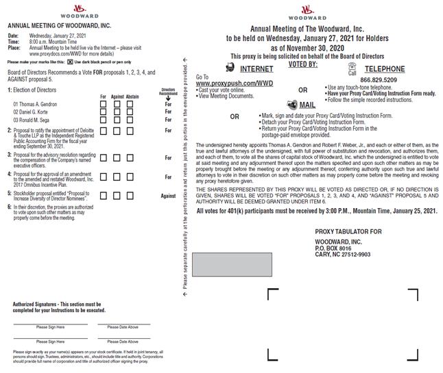 ANNUAL MEETING OF WOODWARD, INC. Date: Wednesday, January 27, 2021 Time: 8:00 a.m. Mountain Time Place: Annual Meeting to be held live via the Internet – please visit www.proxydocs.com/WWD for more details) Please make your marks like this: Use dark black pencil or pen only Board of Directors Recommends a Vote FOR proposals 1, 2, 3, 4, and AGAINST proposal 5. Directors Recommend For For For 1: Election of Directors 01 Thomas A. Gendron 02 Daniel G. Korte 03 Ronald M. Sega For For Against Abstain For Against For2: Proposal to ratify the appointment of Deloitte & Touche LLP as the Independent Registered Public Accounting Firm for the fiscal year ending September 30, 2021. 3: Proposal for the advisory resolution regarding the compensation of the Company’s named executive officers. 4: Proposal for the approval of an amendment to the amended and restated Woodward, Inc. 2017 omnibus Incentive Plan. 5: Stockholder proposal entitled “Proposal to Increase Diversity of Director Nominees”. 6: In their discretion, the proxies are authorized to vote upon such other matters as may properly come before the meeting. Authorized Signatures - This section must be completed for your Instructions to be executed. Please Sign Here Please Date Above Please Sign Here Please Date Above Please sign exactly as your name(s) appears on your stock certificate. If held in joint tenancy, all persons should sign. Trustees, administrators, etc., should include title and authority. Corporations should provide full name of corporation and title of authorized officer signing the proxy. Annual Meeting of The Woodward, Inc. to be held on Wednesday, January 27, 2021 for Holders as of November 30, 2020 This proxy is being solicited on behalf of the Board of Directors INTERNET VOTED BY: TELEPHONE 866.829.5209 Call or Go To www.proxypush.com/WWd Cast your vote online. View Meeting Documents. Use any touch-tone telephone. Have your Proxy Card/Voting Instruction Form ready. Follow the simple recorded instructions. MAIL OR Mark, sign and date your Proxy Card/Voting Instruction Form. Detach your Proxy Card/Voting Instruction Form. Return your Proxy Card/Voting Instruction Form in the postage-paid envelope provided. The undersigned hereby appoints Thomas A. Gendron and Robert F. Weber, Jr., and each or either of them, as the true and lawful attorneys of the undersigned, with full power of substitution and revocation, and authorizes them, and each of them, to vote all the shares of capital stock of Woodward, Inc. which the undersigned is entitled to vote at said meeting and any adjournment thereof upon the matters specified and upon such other matters as may be properly brought before the meeting or any adjournment thereof, conferring authority upon such true and lawful attorneys to vote in their discretion on such other matters as may properly come before the meeting and revoking any proxy heretofore given. THE SHARES REPRESENTED BY THIS PROXY WILL BE VOTED AS DIRECTED OR, IF NO DIRECTION IS GIVEN, SHARES WILL BE VOTED “FOR” PROPOSALS 1, 2, 3, AND 4, AND “AGAINST” PROPOSAL 5 AND AUTHORITY WILL BE DEEMED GRANTED UNDER ITEM 6. All votes for 401(k) participants must be received by 3:00 P.M., Mountain Time, January 25, 2021. PROXY TABULATOR FOR WOODWARD, Inc. P.O. BOX 8016 CARY, NC 27512-9903 Please separate carefully at the perforation and return just this portion in the envelope provided
