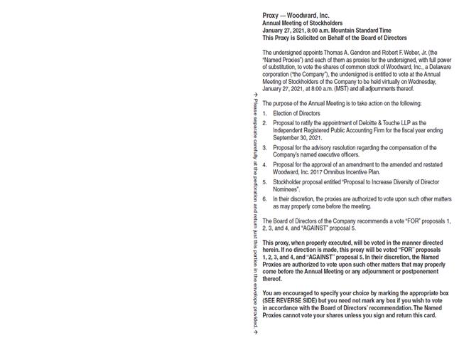 Proxy — Woodward, Inc. Annual Meeting of Stockholders January 27, 2021, 8:00 a.m. Mountain Standard Time This Proxy is Solicited on Behalf of the Board of Directors The undersigned appoints Thomas A. Gendron and Robert F. Weber, Jr. (the “Named Proxies”) and each of them as proxies for the undersigned, with full power of substitution, to vote the shares of common stock of Woodward, Inc., a Delaware corporation (“the Company”), the undersigned is entitled to vote at the Annual Meeting of Stockholders of the Company to be held virtually on Wednesday, January 27, 2021, at 8:00 a.m. (MST) and all adjournments thereof. The purpose of the Annual Meeting is to take action on the following: 1. Election of Directors 2. Proposal to ratify the appointment of Deloitte & Touche LLP as the independent registered public accounting firm for the fiscal year ending September 30, 2021.3. Proposal for the advisory resolution regarding the compensation of the company’s named executive officers.4. Proposal for the approval of an amendment to the amended and restated Woodward, Inc. 2017 omnibus incentive plan. 5.Stockholder proposal entitled “proposal to increase diversity of director nominees”.6.In their discretion, the proxies are authorized to vote upon such other matters as may properly come before the meeting. The Board of Directors of the Company recommends a vote “FOR” proposals 1, 2, 3, and 4, and “AGAINST” proposal 5. This proxy, when properly executed, will be voted in the manner directed herein. If no direction is made, this proxy will be voted “FOR” proposals 1, 2, 3, and 4, and “AGAINST” proposal 5. In their discretion, the Named Proxies are authorized to vote upon such other matters that may properly come before the Annual Meeting or any adjournment or postponement thereof. You are encouraged to specify your choice by marking the appropriate box (SEE REVERSE SIDE) but you need not mark any box if you wish to vote in accordance with the Board of Directors’ recommendation. The Named Proxies cannot vote your shares unless you sign and return this card. Please separate carefully at the perforation and return just this portion in the envelope provided