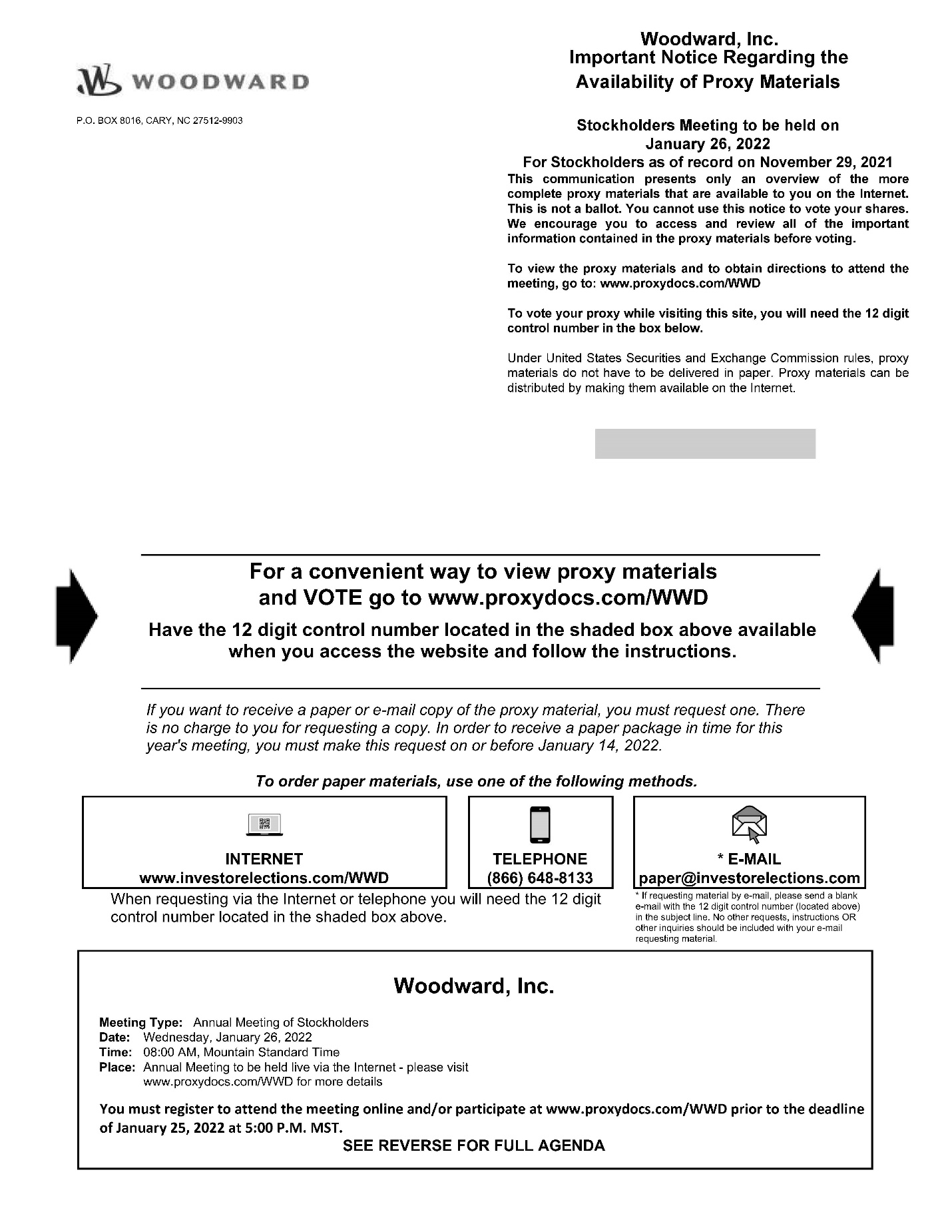 W WOODWARD P.O. BOX 8016, CARY, NC 27512-9903 Woodward, Inc. Important Notice Regarding the Availability of Proxy Materials Stockholders Meeting to be held on January 26, 2022 For Stockholders as of record on November 29, 2021 This communication presents only an overview of the more complete proxy materials that are available to you on the Internet. This is not a ballot. You cannot use this notice to vote your shares. We encourage you to access and review all of the important information contained in the proxy materials before voting. To view the proxy materials and to obtain directions to attend the meeting, go to: www.proxydocs.com/WWD To vote your proxy while visiting this site, you will need the 12 digit control number in the box below. Under United States Securities and Exchange Commission rules, proxy materials do not have to be delivered in paper. Proxy materials can be distributed by making them available on the Internet. For a convenient way to view proxy materials and VOTE go to www.proxydocs.com/WWD Have the 12 digit control number located in the shaded box above available when you access the website and follow the instructions. If you want to receive a paper or e-mail copy of the proxy material, you must request one. There is no charge to you for requesting a copy. In order to receive a paper package in time for this year's meeting, you must make this request on or before January 14, 2022. To order paper materials, use one of the following methods. INTERNET www.investorelections.com/WWD TELEPHONE (866) 648-8133 * E-MAIL paper@investorelections.com When requesting via the Internet or telephone you will need the 12 digit control number located in the shaded box above. * If requesting material by e-mail, please send a blank e-mail with the 12 digit control number (located above) in the subject line. No other requests, instructions OR other inquiries should be included with your e-mail requesting material. Woodward, Inc. Meeting Type: Annual Meeting of Stockholders Date: Wednesday, January 26, 2022 Time: 08:00 AM, Mountain Standard Time Place: Annual Meeting to be held live via the Internet - please visit www.proxydocs.com/WWD for more details You must register to attend the meeting online and/or participate at www.proxydocs.com/WWD prior to the deadline of January 25, 2022 at 5:00 P.M. MST. SEE REVERSE FOR FULL AGENDA