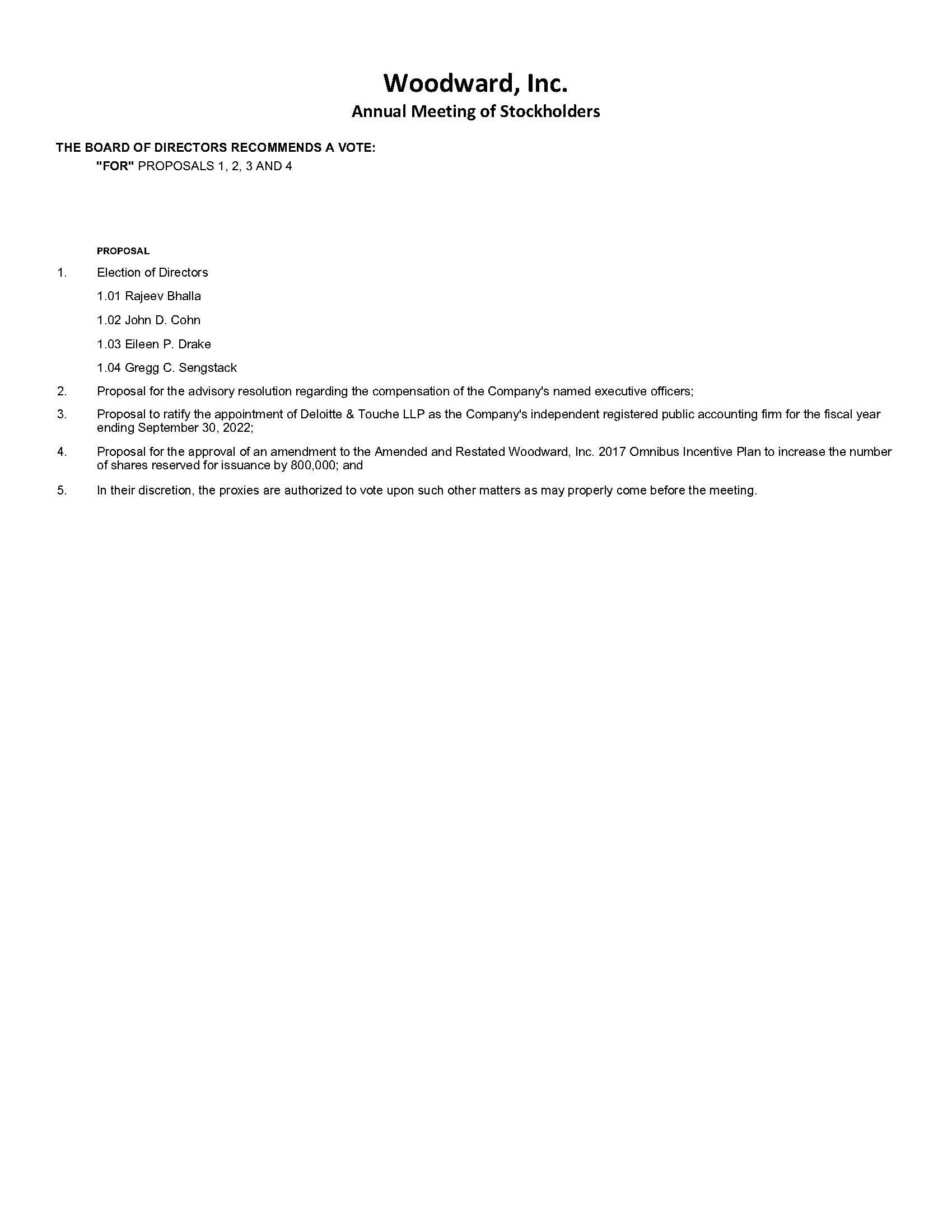 Woodward, Inc. Annual Meeting of Stockholders THE BOARD OF DIRECTORS RECOMMENDS A VOTE: "FOR" PROPOSALS 1, 2, 3 AND 4 PROPOSAL Election of Directors Rajeev Bhalla John D. Cohn Eileen P. Drake Gregg C. Sengstack Proposal for the advisory resolution regarding the compensation of the Company's named executive officers; Proposal to ratify the appointment of Deloitte & Touche LLP as the Company's independent registered public accounting firm for the fiscal year ending September 30, 2022; Proposal for the approval of an amendment to the Amended and Restated Woodward, Inc. 2017 Omnibus Incentive Plan to increase the number of shares reserved for issuance by 800,000; and In their discretion, the proxies are authorized to vote upon such other matters as may properly come before the meeting.