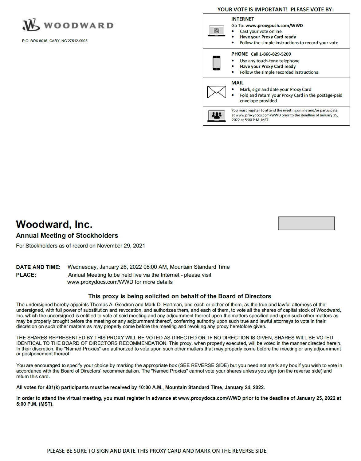W WOODWARD P.O. BOX 8016, CARY, NC 27512-9903 Woodward, Inc. Annual Meeting of Stockholders For Stockholders as of record on November 29, 2021 YOUR VOTE IS IMPORTANT! PLEASE VOTE BY: DATE AND TIME: Wednesday, January 26, 2022 08:00 AM, Mountain Standard Time PLACE: Annual Meeting to be held live via the Internet - please visit www.proxydocs.com/WWD for more details This proxy is being solicited on behalf of the Board of Directors The undersigned hereby appoints Thomas A. Gendron and Mark D. Hartman, and each or either of them, as the true and lawful attorneys of the undersigned, with full power of substitution and revocation, and authorizes them, and each of them, to vote all the shares of capital stock of Woodward, Inc. which the undersigned is entitled to vote at said meeting and any adjournment thereof upon the matters specified and upon such other matters as may be properly brought before the meeting or any adjournment thereof, conferring authority upon such true and lawful attorneys to vote in their discretion on such other matters as may properly come before the meeting and revoking any proxy heretofore given. THE SHARES REPRESENTED BY THIS PROXY WILL BE VOTED AS DIRECTED OR, IF NO DIRECTION IS GIVEN, SHARES WILL BE VOTED IDENTICAL TO THE BOARD OF DIRECTORS RECOMMENDATION. This proxy, when properly executed, will be voted in the manner directed herein. In their discretion, the "Named Proxies" are authorized to vote upon such other matters that may properly come before the meeting or any adjournment or postponement thereof. You are encouraged to specify your choice by marking the appropriate box (SEE REVERSE SIDE) but you need not mark any box if you wish to vote in accordance with the Board of Directors’ recommendation. The "Named Proxies" cannot vote your shares unless you sign (on the reverse side) and return this card. All votes for 401(k) participants must be received by 10:00 A.M., Mountain Standard Time, January 24, 2022. In order to attend the virtual meeting, you must register in advance at www.proxydocs.com/WWD prior to the deadline of January 25, 2022 at 5:00 P.M. (MST). PLEASE BE SURE TO SIGN AND DATE THIS PROXY CARD AND MARK ON THE REVERSE SIDE Date INTERNET Go To: www.proxypush.com/WWD • Cast your vote online • Have your Proxy Card ready • Follow the simple instructions to record your vote PHONE Call 1-866-829-5209 • Use any touch-tone telephone • Have your Proxy Card ready • Follow the simple recorded instructions MAIL • Mark, sign and date your Proxy Card • Fold and return your Proxy Card in the postage-paid envelope provided You must register to attend the meeting online and/or participate at www.proxydocs.com/WWD prior to the deadline of January 25, 2022 at 5:00 P.M. MST.