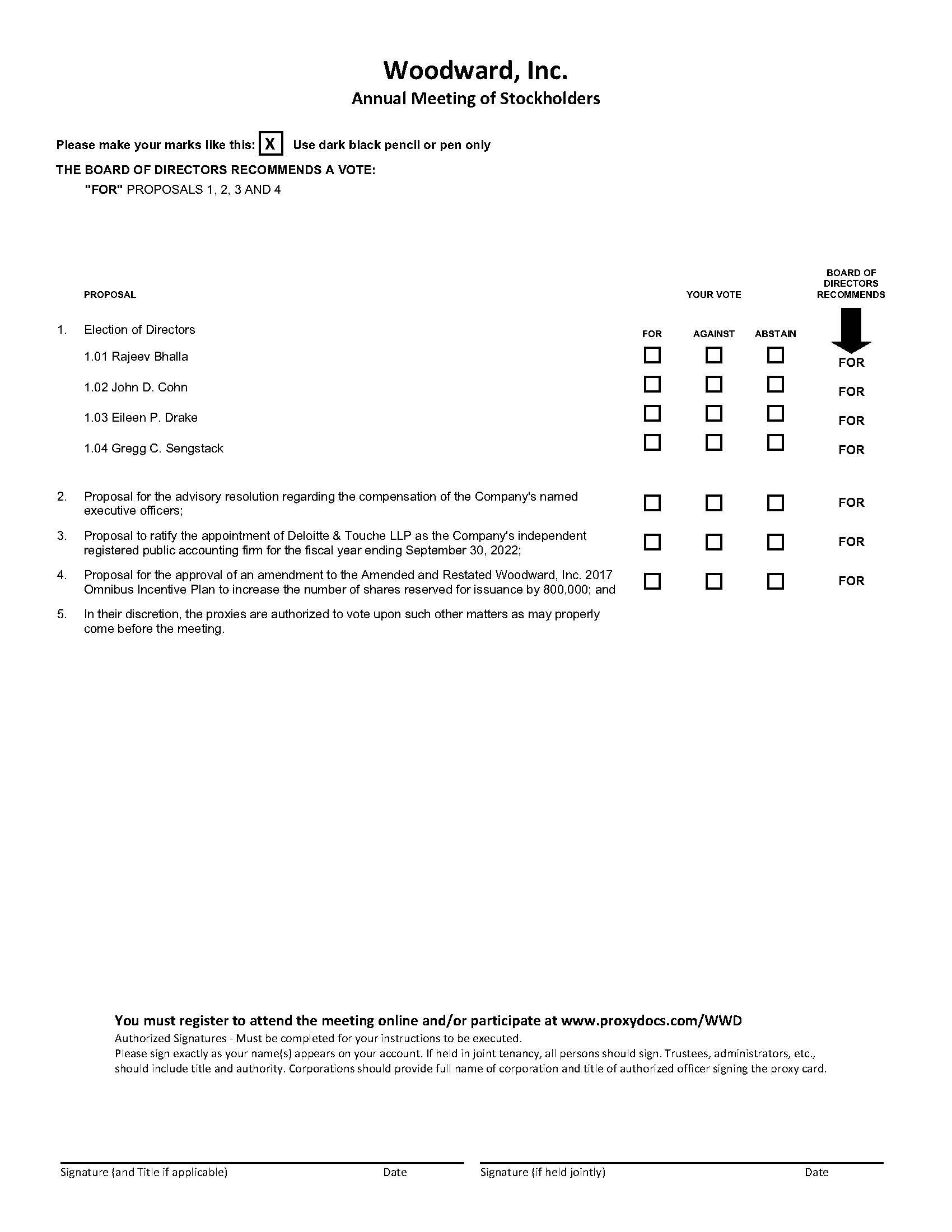 Woodward, Inc. Annual Meeting of Stockholders Please make your marks like this: Use dark black pencil or pen only THE BOARD OF DIRECTORS RECOMMENDS A VOTE: "FOR" PROPOSALS 1, 2, 3 AND 4 PROPOSAL YOUR VOTE BOARD OF DIRECTORS RECOMMENDS FOR FOR FOR FOR FOR FOR FOR 1. Election of Directors 1.01 Rajeev Bhalla FOR AGAINST ABSTAIN 1.02 John D. Cohn 1.03 Eileen P. Drake 1.04 Gregg C. Sengstack 2. Proposal for the advisory resolution regarding the compensation of the Company's named executive officers; 3. Proposal to ratify the appointment of Deloitte & Touche LLP as the Company's independent registered public accounting firm for the fiscal year ending September 30, 2022; 4. Proposal for the approval of an amendment to the Amended and Restated Woodward, Inc. 2017 Omnibus Incentive Plan to increase the number of shares reserved for issuance by 800,000; and 5. In their discretion, the proxies are authorized to vote upon such other matters as may properly come before the meeting. You must register to attend the meeting online and/or participate at www.proxydocs.com/WWD Authorized Signatures - Must be completed for your instructions to be executed. Please sign exactly as your name(s) appears on your account. If held in joint tenancy, all persons should sign. Trustees, administrators, etc., should include title and authority. Corporations should provide full name of corporation and title of authorized officer signing the proxy card. Signature (and Title if applicable) Date Signature (if held jointly) ☐☐☐☐☐☐☐☐☐☐☐☐☐☐☐☐☐☐☐☐☐☒