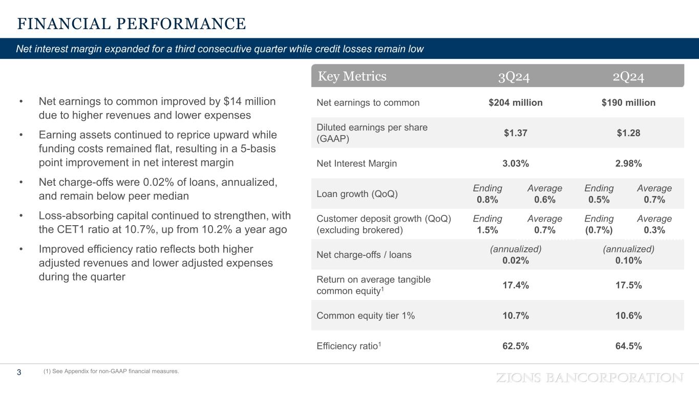 FORWARD-LOOKING STATEMENTS; USE OF NON-GAAP FINANCIAL MEASURES 2 Forward Looking Information This presentation includes “forward-looking statements” as that term is defined in the Private Securities Litigation Reform Act of 1995. These statements are based on management’s current expectations and assumptions regarding future events or determinations, all of which are subject to known and unknown risks, uncertainties, and other factors that may cause our actual results, performance or achievements, industry trends, and results or regulatory outcomes to differ materially from those expressed or implied. Forward-looking statements include, among others: Statements with respect to the beliefs, plans, objectives, goals, targets, commitments, designs, guidelines, expectations, anticipations, and future financial condition, results of operations and performance of Zions Bancorporation, National Association and its subsidiaries (collectively “Zions Bancorporation, N.A.,” “the Bank,” “we,” “our,” “us”); and Statements preceded or followed by, or that include the words “may,” “might,” “can,” “continue,” “could,” “should,” “would,” “believe,” “anticipate,” “estimate,” “forecasts,” “expect,” “intend,” “target,” “commit,” “design,” “plan,” “projects,” “will,” and the negative thereof and similar words and expressions. Forward-looking statements are not guarantees, nor should they be relied upon as representing management’s views as of any subsequent date. Actual results and outcomes may differ materially from those presented. Although the following list is not comprehensive, important factors that may cause material differences include: The quality and composition of our loan and securities portfolios and the quality and composition of our deposits; Changes in general industry, political and economic conditions, including elevated inflation, economic slowdown or recession, or other economic challenges; changes in interest and reference rates, which could adversely affect our revenue and expenses, the value of assets and liabilities, and the availability and cost of capital and liquidity; deterioration in economic conditions that may result in increased loan and leases losses; The effects of newly enacted and proposed regulations affecting us and the banking industry, as well as changes and uncertainties in applicable laws, and fiscal, monetary, regulatory, trade, and tax policies, and actions taken by governments, agencies, central banks, and similar organizations, including those that result in decreases in revenue; increases in bank fees, insurance assessments and capital standards; and other regulatory requirements; Competitive pressures and other factors that may affect aspects of our business, such as pricing and demand for our products and services, and our ability to recruit and retain talent; The impact of technological advancements, digital commerce, artificial intelligence, and other innovations affecting the banking industry; Our ability to complete projects and initiatives and execute on our strategic plans, manage our risks, control compensation and other expenses, and achieve our business objectives; Our ability to develop and maintain technology, information security systems and controls designed to guard against fraud, cybersecurity, and privacy risks; Our ability to provide adequate oversight of our suppliers or prevent inadequate performance by third parties upon whom we rely for the delivery of various products and services; Natural disasters, pandemics, catastrophic events and other emergencies and incidents and their impact on our and our customers’ operations and business and communities, including the increasing difficulty in, and the expense of, obtaining property, auto, business, and other insurance products; Governmental and social responses to environmental, social, and governance issues, including those with respect to climate change; Securities and capital markets behavior, including volatility and changes in market liquidity and our ability to raise capital; The possibility that our recorded goodwill could become impaired, which may have an adverse impact on our earnings and shareholders’ equity; The impact of bank closures or adverse developments at other banks on general investor sentiment regarding the stability and liquidity of banks; Adverse news and other expressions of negative public opinion whether directed at us, other banks, the banking industry, or otherwise that may adversely affect our reputation and that of the banking industry generally; Protracted congressional negotiations and political stalemates regarding government funding and other issues, including those that increase the possibility of government shutdowns, downgrades in United States (“U.S.”) credit ratings, or other economic disruptions; and The effects of wars and geopolitical conflicts, such as the ongoing war between Russia and Ukraine, the war in the Middle East, and other local, national, or international disasters, crises, or conflicts that may occur in the future. Factors that could cause our actual results, performance or achievements, industry trends, and results or regulatory outcomes to differ materially from those expressed or implied in the forward-looking statements are discussed in our 2023 Form 10-K and subsequent filings with the Securities and Exchange Commission (SEC) and are available on our website (www.zionsbancorporation.com) and from the SEC (www.sec.gov). We caution against the undue reliance on forward-looking statements, which reflect our views only as of the date they are made. Except to the extent required by law, we specifically disclaim any obligation to update any factors or to publicly announce the revisions to any forward-looking statements to reflect future events or developments. Use of Non-GAAP Financial Measures: This document contains several refe