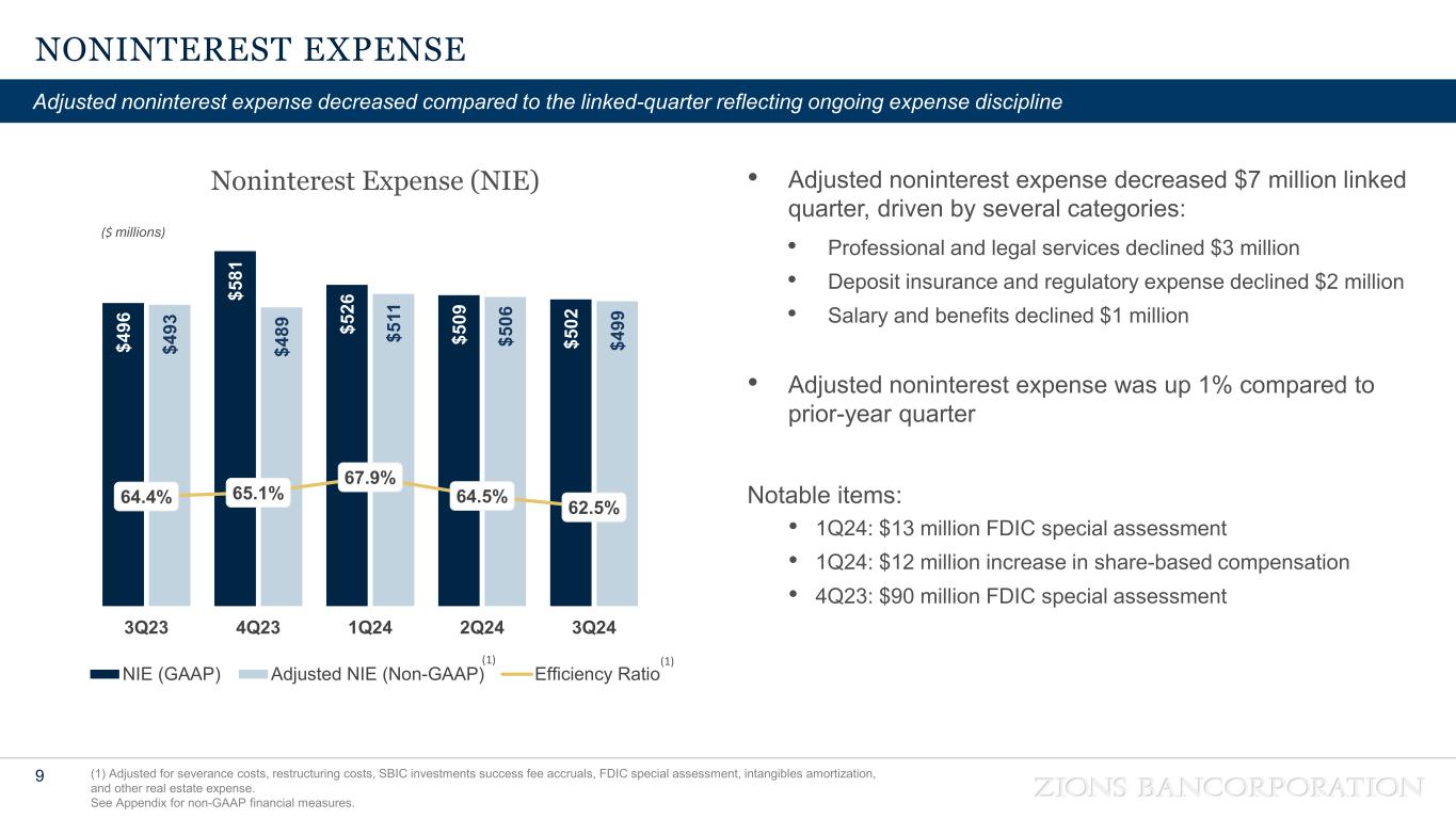 NONINTEREST INCOME AND REVENUE 8 (1) Reflects total customer-related noninterest income, which excludes items such as fair value and non-hedge derivative income, securities gains (losses), and other items as detailed in the noninterest income section of the earnings release. (2) Adjusted revenue is the sum of taxable-equivalent net interest income and noninterest income less adjustments. It excludes the impact of securities gains (losses) and fair value and non-hedge derivative income. See Appendix for non-GAAP financial measures. Increase in customer-related income largely due to growth in Capital Markets $157 $150 $151 $154 $161 3Q23 4Q23 1Q24 2Q24 3Q24 Customer-Related Noninterest Income 1 ($ millions) $7 65 $7 31 $7 42 $7 76 $7 92 $7 65 $7 51 $7 53 $7 84 $7 98 3Q23 4Q23 1Q24 2Q24 3Q24 Total Revenue (GAAP) Adjusted Revenue (Non-GAAP) Total Revenue 2 ($ millions)