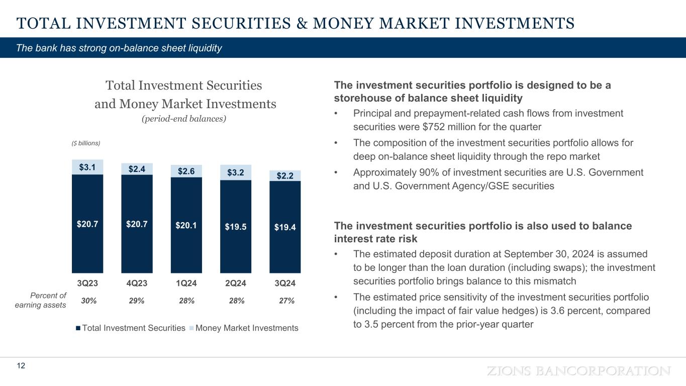 DEPOSIT BALANCE AND BORROWING TRENDS 11 Note: Figures shown in graphs may not foot due to rounding Ending customer deposits increased 1.5% vs. 2Q24 while short-term borrowings decreased more than $2 billion 3Q24 total funding costs remained flat vs 2Q24 • Period-end noninterest-bearing demand deposits grew ~$240 million, or 1% linked-quarter. Noninterest-bearing deposits were 33% of total deposits Average Deposits and Borrowings ($ billions) Ending Deposits and Borrowings ($ billions) $69 $71 $70 $69 $71 $6 $4 $4 $4 $5 $5 $5 $5 $6 $3 - 10 20 30 40 50 60 70 80 90 100 3Q23 4Q23 1Q24 2Q24 3Q24 $68 $70 $69 $70 $70 $8 $6 $4 $5 $5 $5 $5 $7 $7 $6 2.10% 2.25% 2.34% 2.36% 2.36% 0.00% 0.50% 1.00% 1.50% 2.00% 2.50% 3.00% 3.50% 4.00% 4.50% - 10 20 30 40 50 60 70 80 90 100 3Q23 4Q23 1Q24 2Q24 3Q24