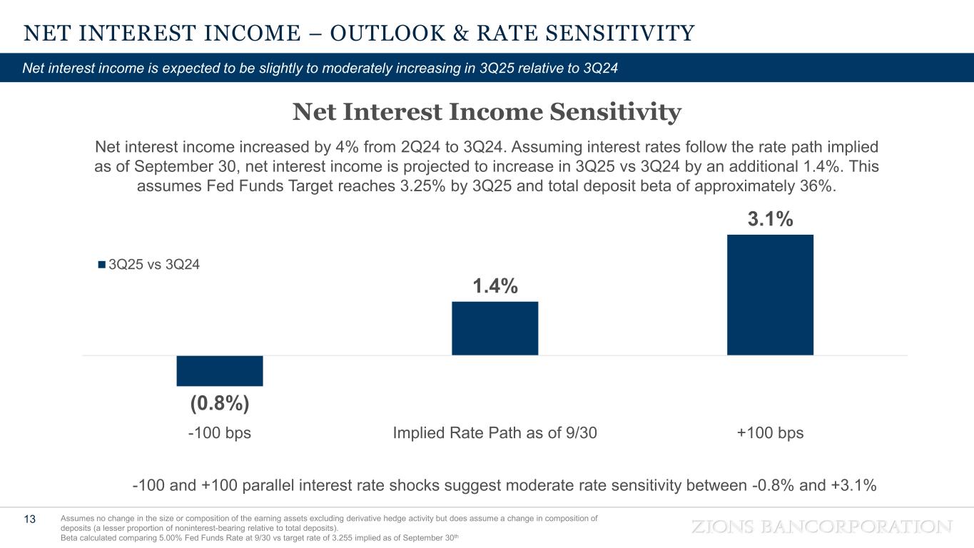 TOTAL INVESTMENT SECURITIES & MONEY MARKET INVESTMENTS 12 The bank has strong on-balance sheet liquidity The investment securities portfolio is designed to be a storehouse of balance sheet liquidity • Principal and prepayment-related cash flows from investment securities were $752 million for the quarter • The composition of the investment securities portfolio allows for deep on-balance sheet liquidity through the repo market • Approximately 90% of investment securities are U.S. Government and U.S. Government Agency/GSE securities The investment securities portfolio is also used to balance interest rate risk • The estimated deposit duration at September 30, 2024 is assumed to be longer than the loan duration (including swaps); the investment securities portfolio brings balance to this mismatch • The estimated price sensitivity of the investment securities portfolio (including the impact of fair value hedges) is 3.6 percent, compared to 3.5 percent from the prior-year quarter Total Investment Securities and Money Market Investments (period-end balances) $20.7 $20.7 $20.1 $19.5 $19.4 $3.1 $2.4 $2.6 $3.2 $2.2 3Q23 4Q23 1Q24 2Q24 3Q24 Total Investment Securities Money Market Investments 30% 29% 28% 28% 27%Percent of earning assets ($ billions)