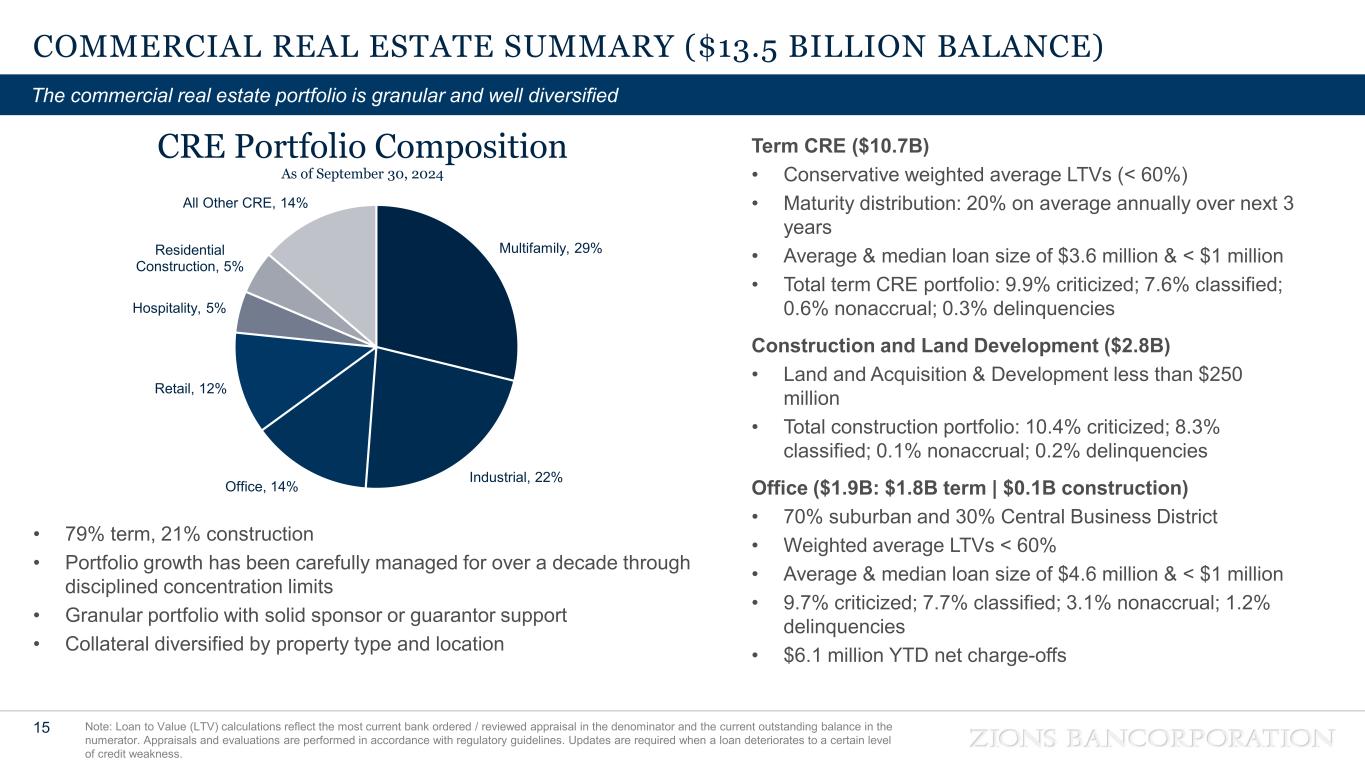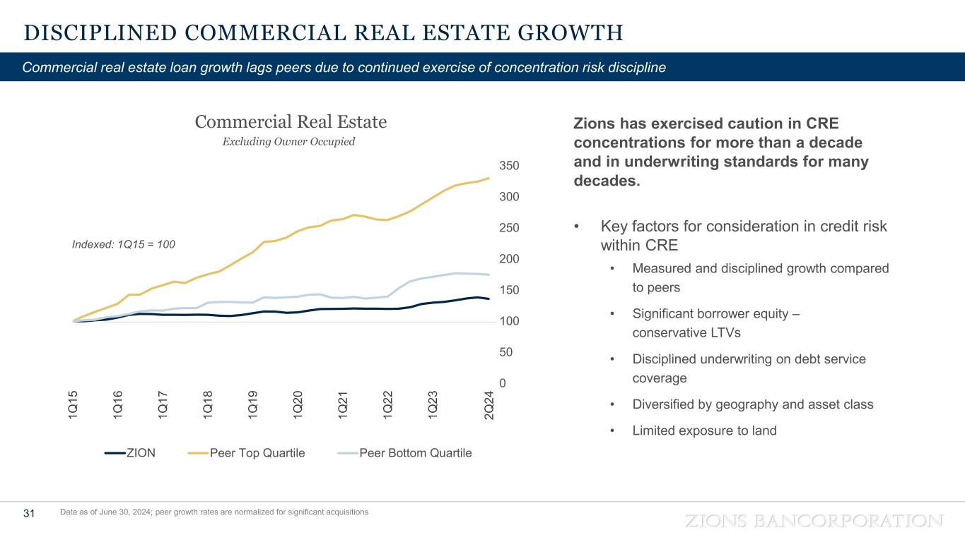 IN-DEPTH REVIEW: COMMERCIAL REAL ESTATE 30 Data is updated through 3Q24. LTV calculations in the “Appraised Value” distribution to reflect most current appraisal in denominator and outstanding balance in the numerator. The Indexed Adjusted values are adjusted based on the MSA level REIS Commercial Property Price Indices and adjusted from the date of most current appraisal. . Limited tail loan-to-value risk in portfolio; controlled CRE growth Term WAVG LTV % of CRE Term % of CRE Construction Multifamily 57% 26% 52% Industrial / Warehouse 52% 24% 23% Office 56% 16% 5% Retail 47% 14% 5% Hospitality 45% 6% 2% Zions has modest “tail risk” in its CRE portfolio Total CRE Portfolio Trends Total CRE Problem Loan Trends as a percentage of total loans 0% 5% 10% 15% 20% 25% 30% 35% 40% <=40% 41-50% 51-60% 61-70% 71-80% 81-90% 91-100% 100%+ Term CRE LTVs Appraised vs. Indexed Most Current Appraisal Index Adjusted 0% 2% 4% 6% 8% 10% 12% 3Q22 4Q22 1Q23 2Q23 3Q23 4Q23 1Q24 2Q24 3Q24 Criticized % Classified % Nonaccrual % TTM GCO Rate 2.6 2.7 2.7 2.7 2.8 10.6 10.7 10.9 10.8 10.7 3Q23 4Q24 1Q24 2Q24 3Q24 Construction Balances Term Balances