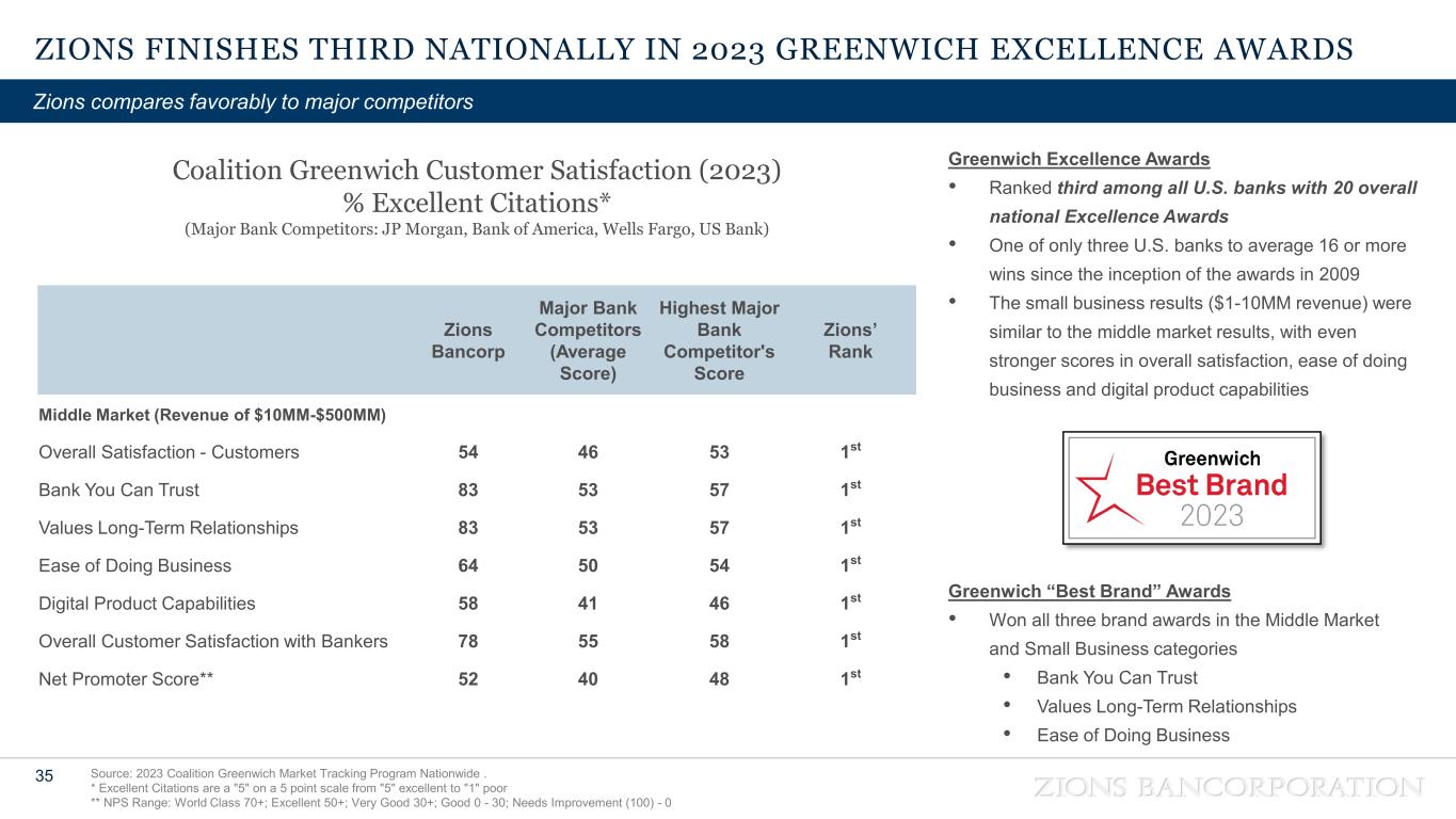 ZIONS FINISHES THIRD NATIONALLY IN 2023 GREENWICH EXCELLENCE AWARDS 35 Source: 2023 Coalition Greenwich Market Tracking Program Nationwide . * Excellent Citations are a "5" on a 5 point scale from "5" excellent to "1" poor ** NPS Range: World Class 70+; Excellent 50+; Very Good 30+; Good 0 - 30; Needs Improvement (100) - 0 Zions compares favorably to major competitors Greenwich Excellence Awards • Ranked third among all U.S. banks with 20 overall national Excellence Awards • One of only three U.S. banks to average 16 or more wins since the inception of the awards in 2009 • The small business results ($1-10MM revenue) were similar to the middle market results, with even stronger scores in overall satisfaction, ease of doing business and digital product capabilities Greenwich “Best Brand” Awards • Won all three brand awards in the Middle Market and Small Business categories • Bank You Can Trust • Values Long-Term Relationships • Ease of Doing Business Zions Bancorp Major Bank Competitors (Average Score) Highest Major Bank Competitor's Score Zions’ Rank Middle Market (Revenue of $10MM-$500MM) Overall Satisfaction - Customers 54 46 53 1st Bank You Can Trust 83 53 57 1st Values Long-Term Relationships 83 53 57 1st Ease of Doing Business 64 50 54 1st Digital Product Capabilities 58 41 46 1st Overall Customer Satisfaction with Bankers 78 55 58 1st Net Promoter Score** 52 40 48 1st Coalition Greenwich Customer Satisfaction (2023) % Excellent Citations* (Major Bank Competitors: JP Morgan, Bank of America, Wells Fargo, US Bank)