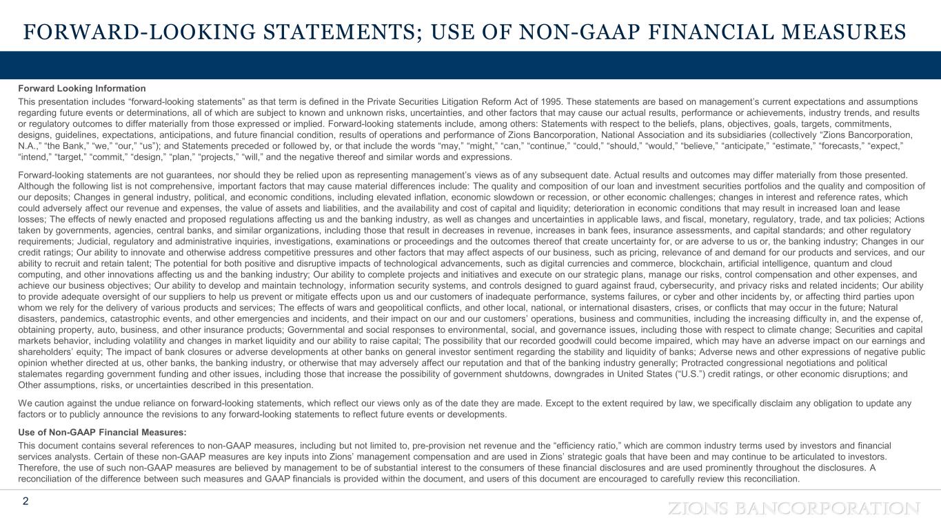 FORWARD-LOOKING STATEMENTS; USE OF NON-GAAP FINANCIAL MEASURES 2 Forward Looking Information This presentation includes “forward-looking statements” as that term is defined in the Private Securities Litigation Reform Act of 1995. These statements are based on management’s current expectations and assumptions regarding future events or determinations, all of which are subject to known and unknown risks, uncertainties, and other factors that may cause our actual results, performance or achievements, industry trends, and results or regulatory outcomes to differ materially from those expressed or implied. Forward-looking statements include, among others: Statements with respect to the beliefs, plans, objectives, goals, targets, commitments, designs, guidelines, expectations, anticipations, and future financial condition, results of operations and performance of Zions Bancorporation, National Association and its subsidiaries (collectively “Zions Bancorporation, N.A.,” “the Bank,” “we,” “our,” “us”); and Statements preceded or followed by, or that include the words “may,” “might,” “can,” “continue,” “could,” “should,” “would,” “believe,” “anticipate,” “estimate,” “forecasts,” “expect,” “intend,” “target,” “commit,” “design,” “plan,” “projects,” “will,” and the negative thereof and similar words and expressions. Forward-looking statements are not guarantees, nor should they be relied upon as representing management’s views as of any subsequent date. Actual results and outcomes may differ materially from those presented. Although the following list is not comprehensive, important factors that may cause material differences include: The quality and composition of our loan and investment securities portfolios and the quality and composition of our deposits; Changes in general industry, political, and economic conditions, including elevated inflation, economic slowdown or recession, or other economic challenges; changes in interest and reference rates, which could adversely affect our revenue and expenses, the value of assets and liabilities, and the availability and cost of capital and liquidity; deterioration in economic conditions that may result in increased loan and lease losses; The effects of newly enacted and proposed regulations affecting us and the banking industry, as well as changes and uncertainties in applicable laws, and fiscal, monetary, regulatory, trade, and tax policies; Actions taken by governments, agencies, central banks, and similar organizations, including those that result in decreases in revenue, increases in bank fees, insurance assessments, and capital standards; and other regulatory requirements; Judicial, regulatory and administrative inquiries, investigations, examinations or proceedings and the outcomes thereof that create uncertainty for, or are adverse to us or, the banking industry; Changes in our credit ratings; Our ability to innovate and otherwise address competitive pressures and other factors that may affect aspects of our business, such as pricing, relevance of and demand for our products and services, and our ability to recruit and retain talent; The potential for both positive and disruptive impacts of technological advancements, such as digital currencies and commerce, blockchain, artificial intelligence, quantum and cloud computing, and other innovations affecting us and the banking industry; Our ability to complete projects and initiatives and execute on our strategic plans, manage our risks, control compensation and other expenses, and achieve our business objectives; Our ability to develop and maintain technology, information security systems, and controls designed to guard against fraud, cybersecurity, and privacy risks and related incidents; Our ability to provide adequate oversight of our suppliers to help us prevent or mitigate effects upon us and our customers of inadequate performance, systems failures, or cyber and other incidents by, or affecting third parties upon whom we rely for the delivery of various products and services; The effects of wars and geopolitical conflicts, and other local, national, or international disasters, crises, or conflicts that may occur in the future; Natural disasters, pandemics, catastrophic events, and other emergencies and incidents, and their impact on our and our customers’ operations, business and communities, including the increasing difficulty in, and the expense of, obtaining property, auto, business, and other insurance products; Governmental and social responses to environmental, social, and governance issues, including those with respect to climate change; Securities and capital markets behavior, including volatility and changes in market liquidity and our ability to raise capital; The possibility that our recorded goodwill could become impaired, which may have an adverse impact on our earnings and shareholders’ equity; The impact of bank closures or adverse developments at other banks on general investor sentiment regarding the stability and liquidity of banks; Adverse news and other expressions of negative public opinion whether directed at us, other banks, the banking industry, or otherwise that may adversely affect our reputation and that of the banking industry generally; Protracted congressional negotiations and political stalemates regarding government funding and other issues, including those that increase the possibility of government shutdowns, downgrades in United States (“U.S.”) credit ratings, or other economic disruptions; and Other assumptions, risks, or uncertainties described in this presentation. We caution against the undue reliance on forward-looking statements, which reflect our views only as of the date they are made. Except to the extent required by law, we specifically disclaim any obligation to update any factors or to publicly announce the revisions to any forward-loo