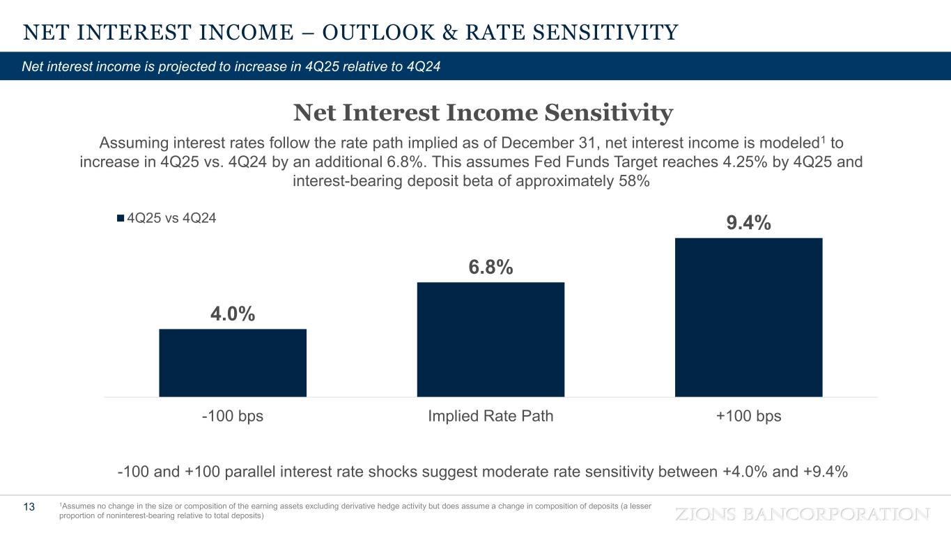 TOTAL INVESTMENT SECURITIES & MONEY MARKET INVESTMENTS 12 The bank has strong on-balance sheet liquidity The investment securities portfolio is designed to be a storehouse of balance sheet liquidity • Principal and prepayment-related cash flows from investment securities were $749 million for the quarter, offset by reinvestment of $379 million • The composition of the investment securities portfolio allows for deep on-balance sheet liquidity through the repo market • Approximately 90% of investment securities are U.S. Government and U.S. Government Agency/GSE securities The investment securities portfolio is also used to balance interest rate risk • The estimated deposit duration at December 31, 2024 was assumed to be longer than the loan duration (including swaps); the investment securities portfolio balanced this mismatch • The estimated price sensitivity of the investment securities portfolio (including the impact of fair value hedges) was 3.4 years, compared to 3.6 years from the prior-year quarter Total Investment Securities and Money Market Investments (period-end balances) $20.7 $20.1 $19.5 $19.4 $18.8 $2.4 $2.6 $3.2 $2.2 $4.3 4Q23 1Q24 2Q24 3Q24 4Q24 Total Investment Securities Money Market Investments 29% 28% 28% 27% 28% % of earning assets ($ b ill io ns )