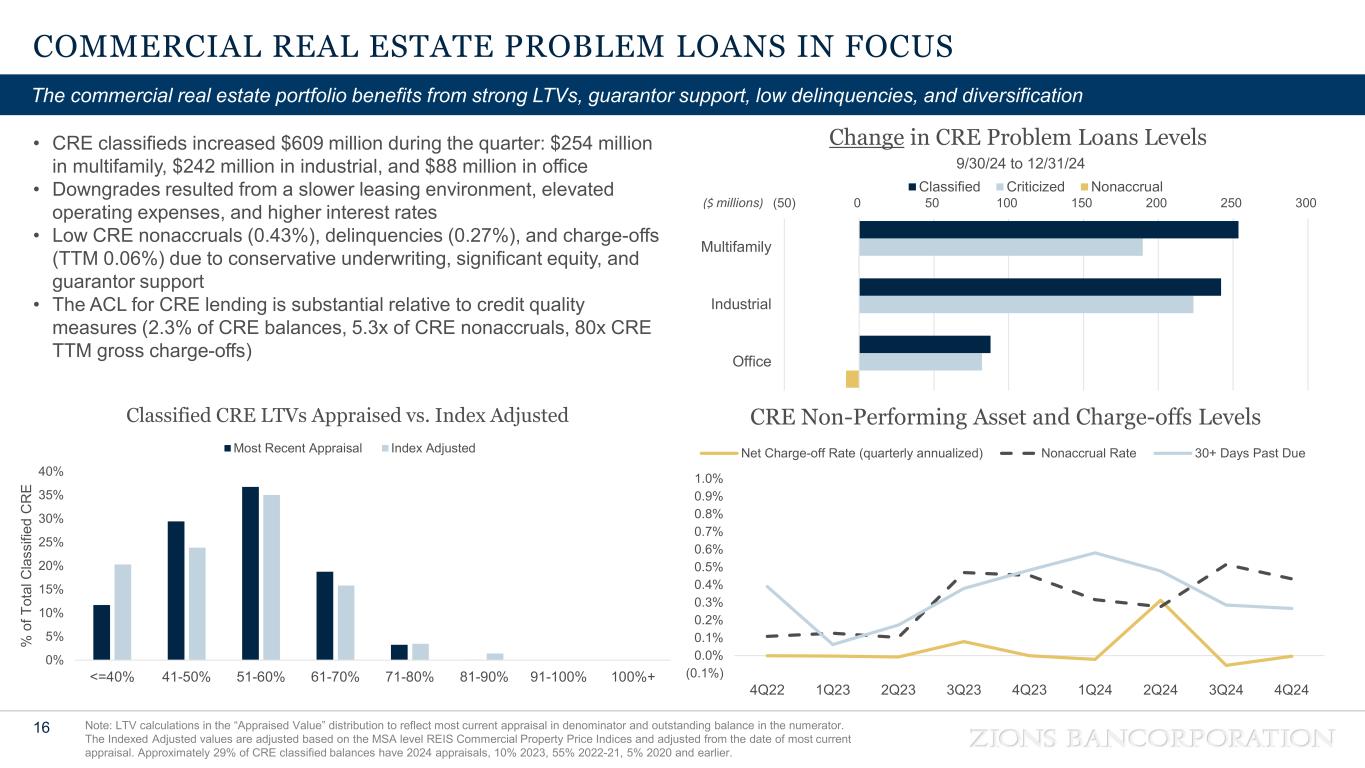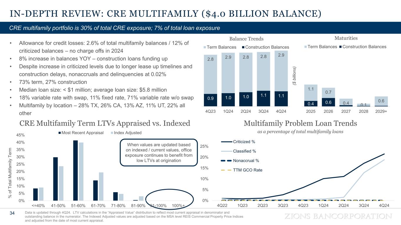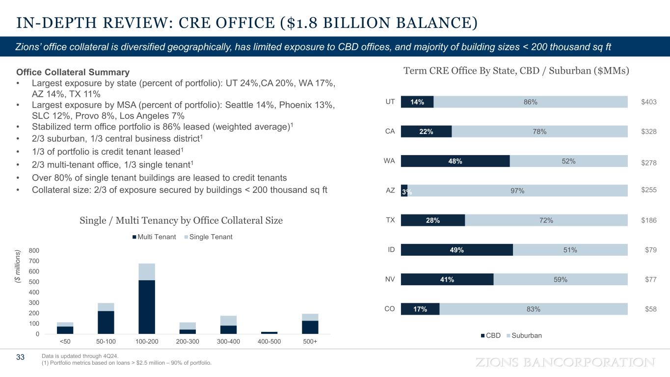 IN-DEPTH REVIEW: COMMERCIAL REAL ESTATE 30 Data is updated through 4Q24. LTV calculations in the “Appraised Value” distribution to reflect most current appraisal in denominator and outstanding balance in the numerator. The Indexed Adjusted values are adjusted based on the MSA level REIS Commercial Property Price Indices and adjusted from the date of most current appraisal. Limited tail loan-to-value risk in portfolio; controlled CRE growth Term WAVG LTV % of CRE Term % of CRE Construction Multifamily 57% 27% 51% Industrial / Warehouse 53% 23% 23% Office 56% 16% 5% Retail 48% 13% 4% Hospitality 48% 6% 1% Zions has modest “tail risk” in its CRE portfolio Total CRE Problem Loan Trends as a percentage of total CRE loans 0% 5% 10% 15% 20% 25% 30% 35% 40% <=40% 41-50% 51-60% 61-70% 71-80% 81-90% 91-100% 100%+ % o f T ot al T er m B al an ce s Term CRE LTVs Appraised vs. Indexed Most Recent Appraisal Index Adjusted 2.7 2.7 2.7 2.8 2.8 10.7 10.9 10.8 10.6 10.7 4Q23 1Q24 2Q24 3Q24 4Q24 Term Balances Construction Balances 1.0 1.1 0.4 3.2 1.8 1.7 0.9 3.1 2025 2026 2027 2028 2029+ Maturities Term Balances Construction Balances 0% 5% 10% 15% 20% 25% 4Q22 1Q23 2Q23 3Q23 4Q23 1Q24 2Q24 3Q24 4Q24 Criticized % Classified % Nonaccrual % TTM GCO Rate ($ b illi on s) Balance Trends
