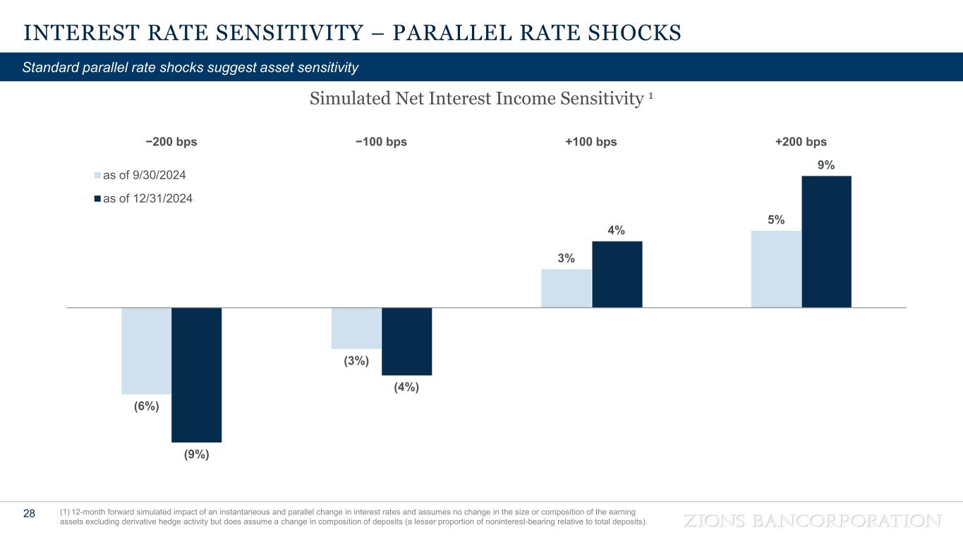 INTEREST RATE SENSITIVITY – PARALLEL RATE SHOCKS 28 (1) 12-month forward simulated impact of an instantaneous and parallel change in interest rates and assumes no change in the size or composition of the earning assets excluding derivative hedge activity but does assume a change in composition of deposits (a lesser proportion of noninterest-bearing relative to total deposits). Standard parallel rate shocks suggest asset sensitivity (6%) (3%) 3% 5% (9%) (4%) 4% 9% −200 bps −100 bps +100 bps +200 bps Simulated Net Interest Income Sensitivity 1 as of 9/30/2024 as of 12/31/2024