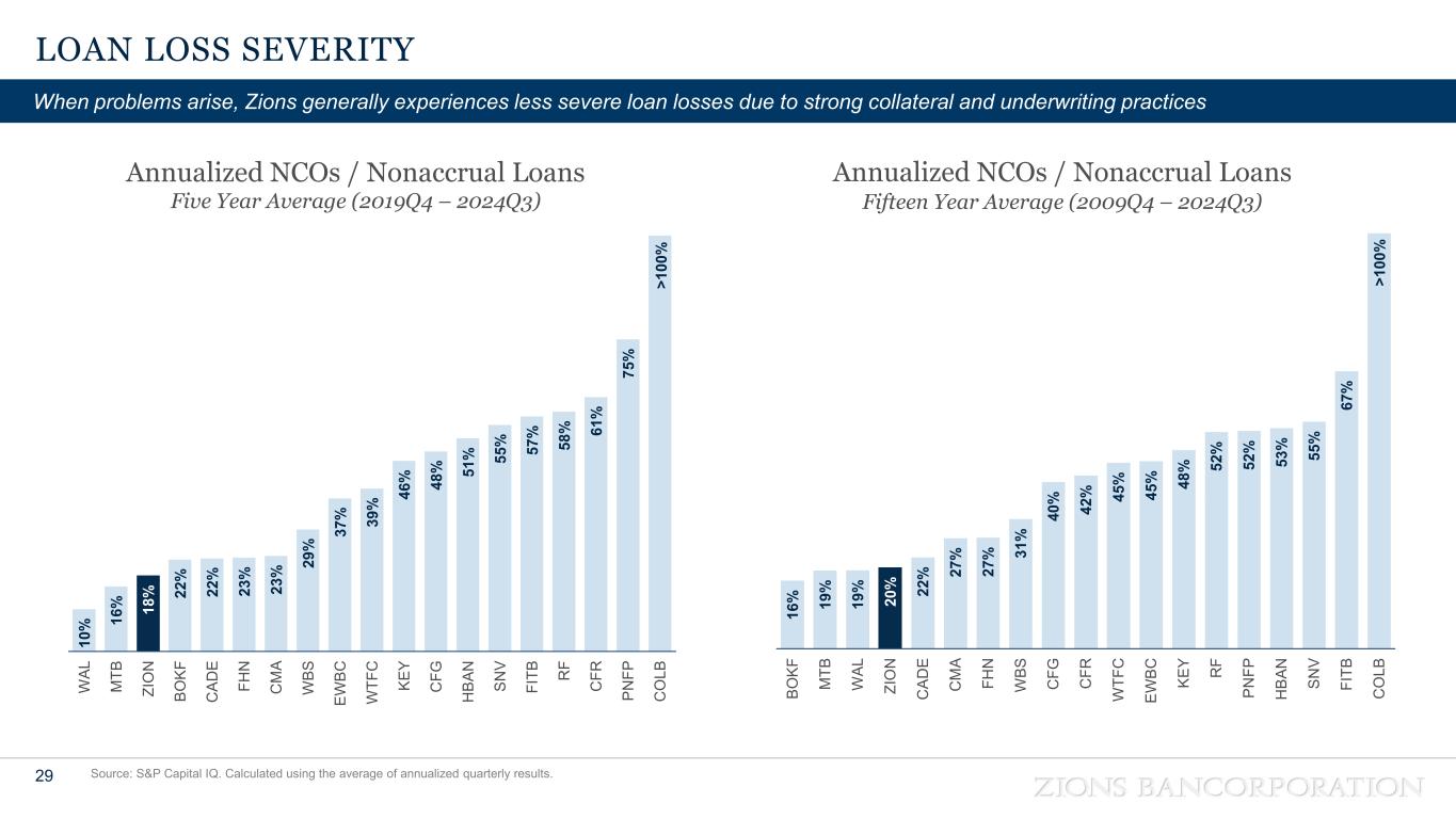 LOAN LOSS SEVERITY 29 Source: S&P Capital IQ. Calculated using the average of annualized quarterly results. When problems arise, Zions generally experiences less severe loan losses due to strong collateral and underwriting practices 10 % 16 % 18 % 22 % 22 % 23 % 23 % 29 % 37 % 39 % 46 % 48 % 51 % 55 % 57 % 58 % 61 % 75 % W AL M TB ZI O N BO KF C AD E FH N C M A W BS EW BC W TF C KE Y C FG H BA N SN V FI TB R F C FR PN FP C O LB Annualized NCOs / Nonaccrual Loans Five Year Average (2019Q4 – 2024Q3) Annualized NCOs / Nonaccrual Loans Fifteen Year Average (2009Q4 – 2024Q3) 16 % 19 % 19 % 20 % 22 % 27 % 27 % 31 % 40 % 42 % 45 % 45 % 48 % 52 % 52 % 53 % 55 % 67 % BO KF M TB W AL ZI O N C AD E C M A FH N W BS C FG C FR W TF C EW BC KE Y R F PN FP H BA N SN V FI TB C O LB >1 00 % >1 00 %