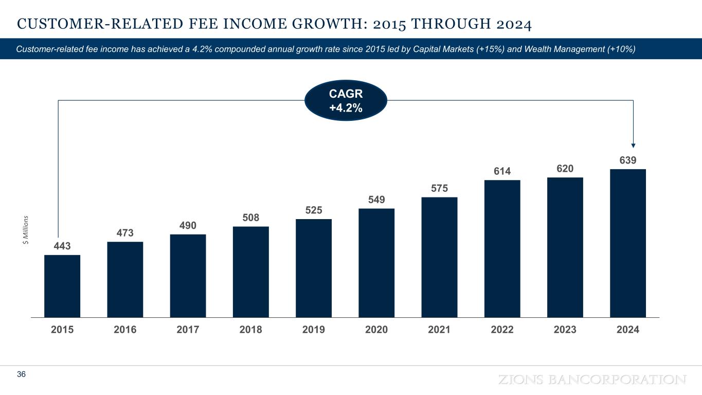 443 473 490 508 525 549 575 614 620 639 2015 2016 2017 2018 2019 2020 2021 2022 2023 2024 $ M ill io ns CUSTOMER-RELATED FEE INCOME GROWTH: 2015 THROUGH 2024 36 Customer-related fee income has achieved a 4.2% compounded annual growth rate since 2015 led by Capital Markets (+15%) and Wealth Management (+10%) CAGR +4.2%