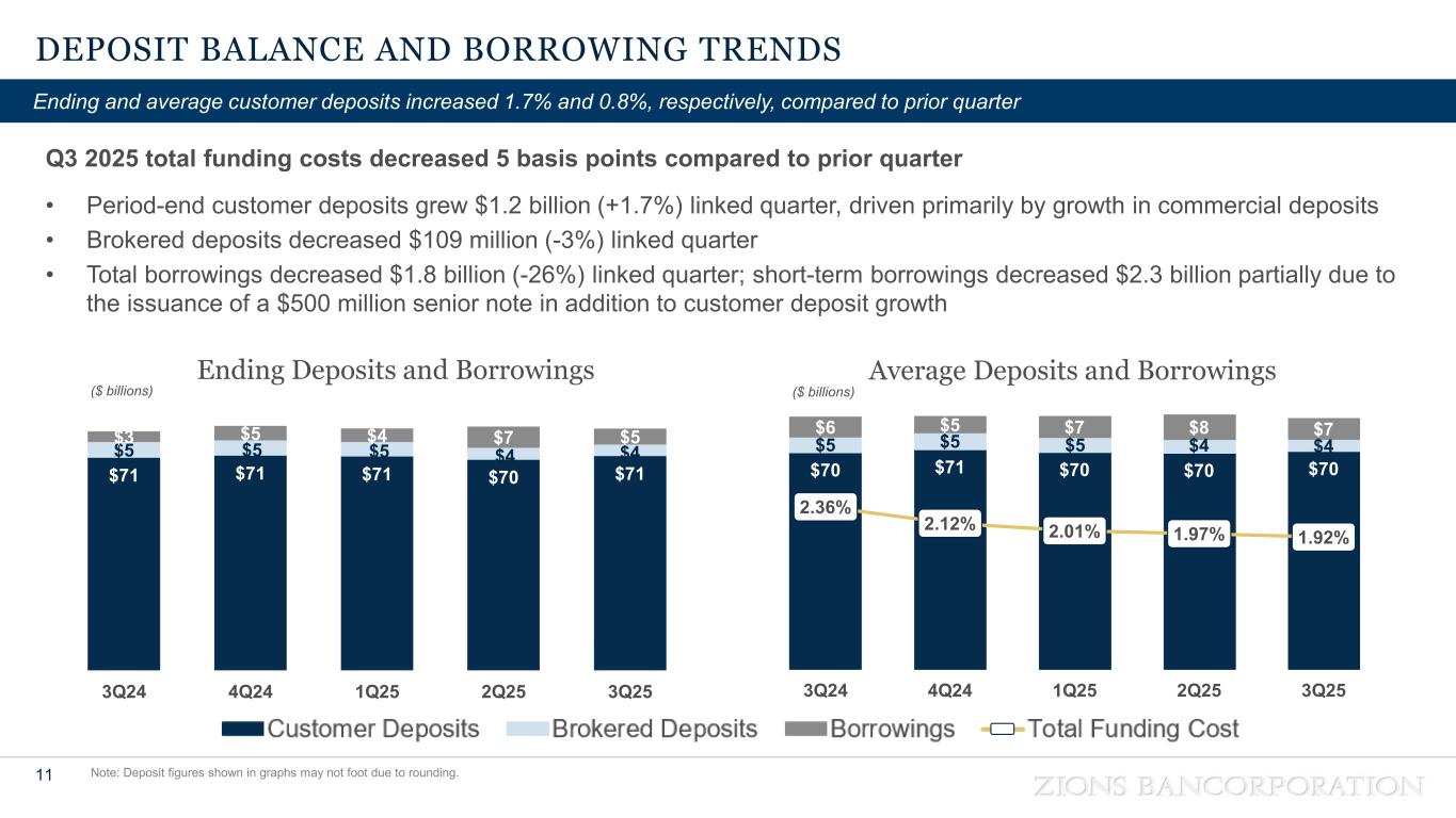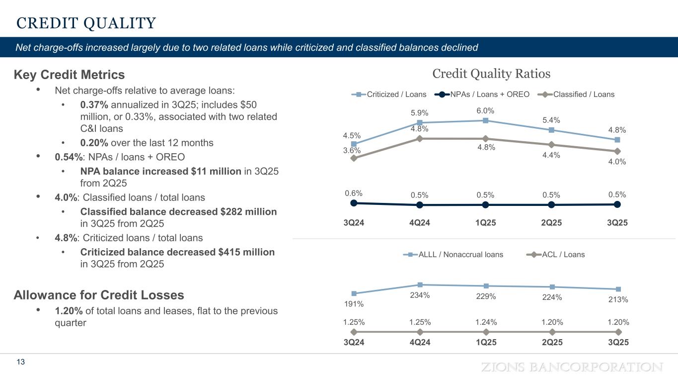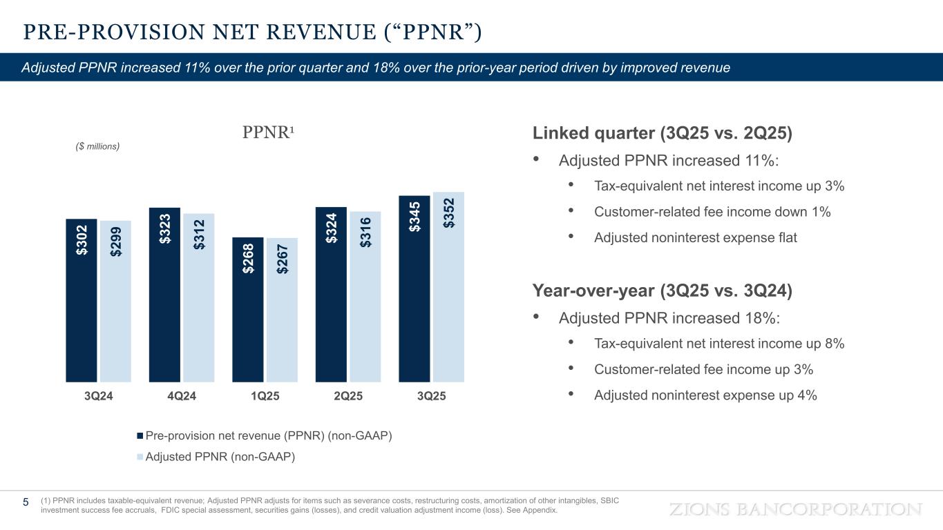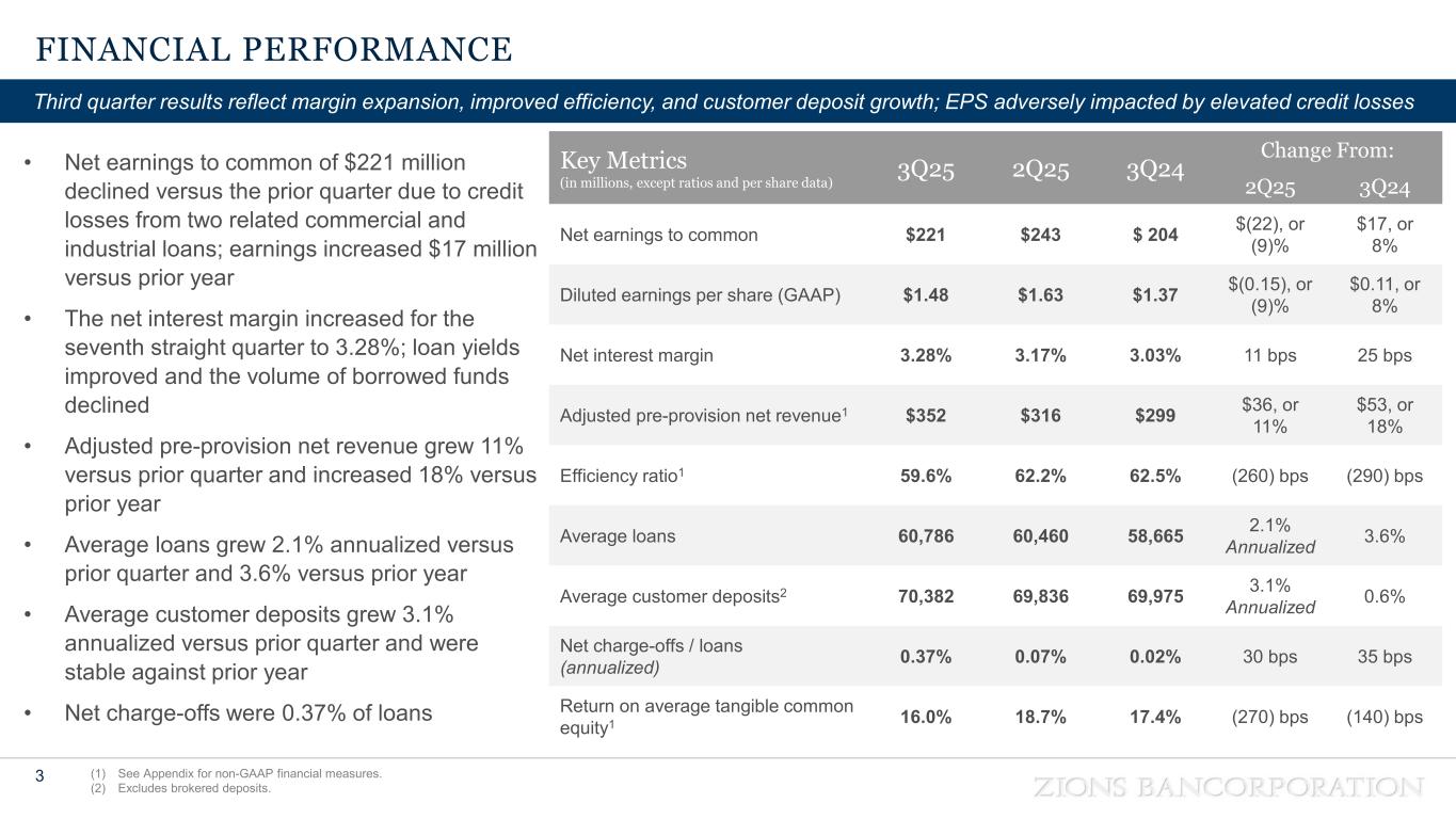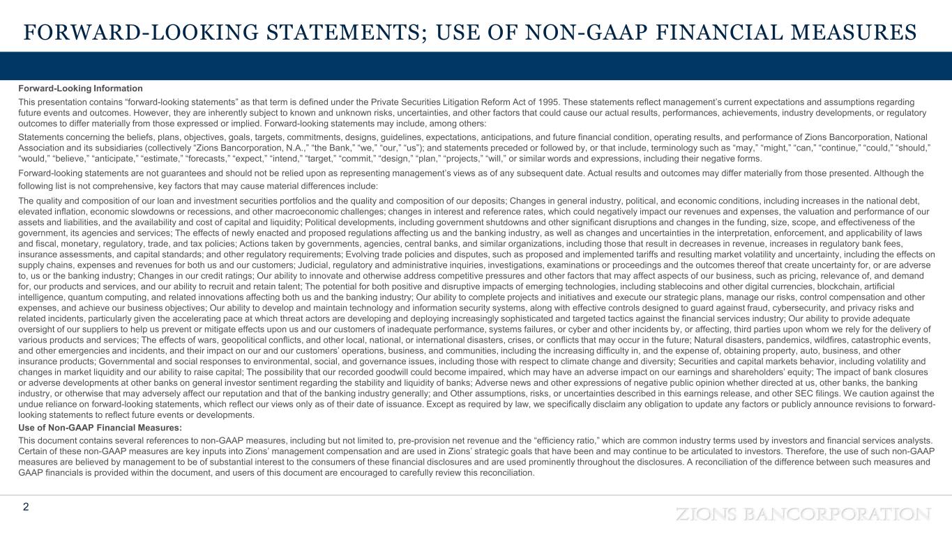 FORWARD-LOOKING STATEMENTS; USE OF NON-GAAP FINANCIAL MEASURES 2 Forward-Looking Information This presentation contains “forward-looking statements” as that term is defined under the Private Securities Litigation Reform Act of 1995. These statements reflect management’s current expectations and assumptions regarding future events and outcomes. However, they are inherently subject to known and unknown risks, uncertainties, and other factors that could cause our actual results, performances, achievements, industry developments, or regulatory outcomes to differ materially from those expressed or implied. Forward-looking statements may include, among others: Statements concerning the beliefs, plans, objectives, goals, targets, commitments, designs, guidelines, expectations, anticipations, and future financial condition, operating results, and performance of Zions Bancorporation, National Association and its subsidiaries (collectively “Zions Bancorporation, N.A.,” “the Bank,” “we,” “our,” “us”); and statements preceded or followed by, or that include, terminology such as “may,” “might,” “can,” “continue,” “could,” “should,” “would,” “believe,” “anticipate,” “estimate,” “forecasts,” “expect,” “intend,” “target,” “commit,” “design,” “plan,” “projects,” “will,” or similar words and expressions, including their negative forms. Forward-looking statements are not guarantees and should not be relied upon as representing management’s views as of any subsequent date. Actual results and outcomes may differ materially from those presented. Although the following list is not comprehensive, key factors that may cause material differences include: The quality and composition of our loan and investment securities portfolios and the quality and composition of our deposits; Changes in general industry, political, and economic conditions, including increases in the national debt, elevated inflation, economic slowdowns or recessions, and other macroeconomic challenges; changes in interest and reference rates, which could negatively impact our revenues and expenses, the valuation and performance of our assets and liabilities, and the availability and cost of capital and liquidity; Political developments, including government shutdowns and other significant disruptions and changes in the funding, size, scope, and effectiveness of the government, its agencies and services; The effects of newly enacted and proposed regulations affecting us and the banking industry, as well as changes and uncertainties in the interpretation, enforcement, and applicability of laws and fiscal, monetary, regulatory, trade, and tax policies; Actions taken by governments, agencies, central banks, and similar organizations, including those that result in decreases in revenue, increases in regulatory bank fees, insurance assessments, and capital standards; and other regulatory requirements; Evolving trade policies and disputes, such as proposed and implemented tariffs and resulting market volatility and uncertainty, including the effects on supply chains, expenses and revenues for both us and our customers; Judicial, regulatory and administrative inquiries, investigations, examinations or proceedings and the outcomes thereof that create uncertainty for, or are adverse to, us or the banking industry; Changes in our credit ratings; Our ability to innovate and otherwise address competitive pressures and other factors that may affect aspects of our business, such as pricing, relevance of, and demand for, our products and services, and our ability to recruit and retain talent; The potential for both positive and disruptive impacts of emerging technologies, including stablecoins and other digital currencies, blockchain, artificial intelligence, quantum computing, and related innovations affecting both us and the banking industry; Our ability to complete projects and initiatives and execute our strategic plans, manage our risks, control compensation and other expenses, and achieve our business objectives; Our ability to develop and maintain technology and information security systems, along with effective controls designed to guard against fraud, cybersecurity, and privacy risks and related incidents, particularly given the accelerating pace at which threat actors are developing and deploying increasingly sophisticated and targeted tactics against the financial services industry; Our ability to provide adequate oversight of our suppliers to help us prevent or mitigate effects upon us and our customers of inadequate performance, systems failures, or cyber and other incidents by, or affecting, third parties upon whom we rely for the delivery of various products and services; The effects of wars, geopolitical conflicts, and other local, national, or international disasters, crises, or conflicts that may occur in the future; Natural disasters, pandemics, wildfires, catastrophic events, and other emergencies and incidents, and their impact on our and our customers’ operations, business, and communities, including the increasing difficulty in, and the expense of, obtaining property, auto, business, and other insurance products; Governmental and social responses to environmental, social, and governance issues, including those with respect to climate change and diversity; Securities and capital markets behavior, including volatility and changes in market liquidity and our ability to raise capital; The possibility that our recorded goodwill could become impaired, which may have an adverse impact on our earnings and shareholders’ equity; The impact of bank closures or adverse developments at other banks on general investor sentiment regarding the stability and liquidity of banks; Adverse news and other expressions of negative public opinion whether directed at us, other banks, the banking industry, or otherwise that may adversely affect our reputatio