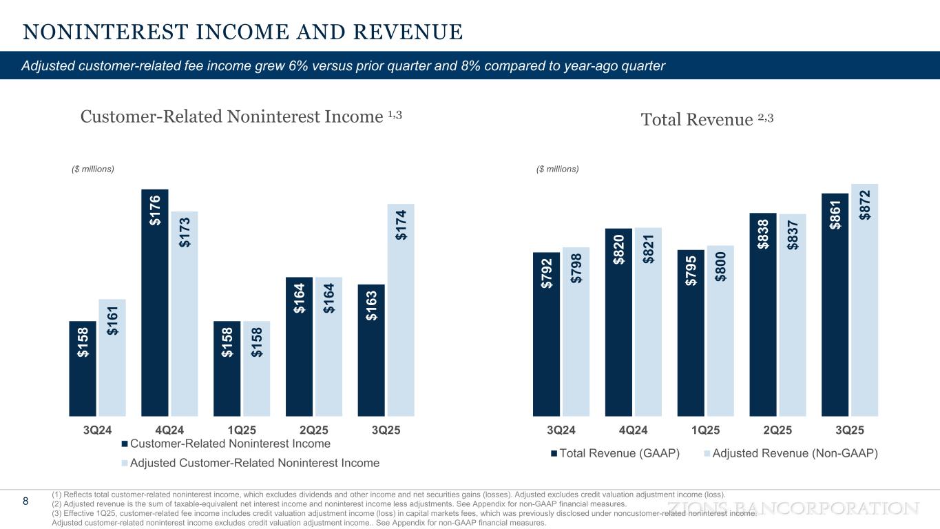 (0.17%) 0.02% 0.58% 0.06% (0.19%)2.98% 3.28% (0.05%) 0.11% (0.04%) 0.08% 0.01% 3.17% 3.28% NET INTEREST MARGIN 7 (1) The impact of noninterest-bearing sources of funds on the net interest margin is calculated as the difference between interest earning assets and interest-bearing liabilities divided by earnings assets multiplied by rate paid on interest-bearing liabilities. Improved loan yields and lower borrowings volume drove expansion versus prior quarter; deposit repricing lifted margin over the year-ago quarter Year-Over-Year (3Q25 vs. 3Q24)Linked Quarter (3Q25 vs. 2Q25) Loans DepositsMoney Mkt & Securities Borrowings Free Funds1 Loans DepositsMoney Mkt & Securities Borrowings Free Funds1 3Q24 3Q252Q25 3Q25