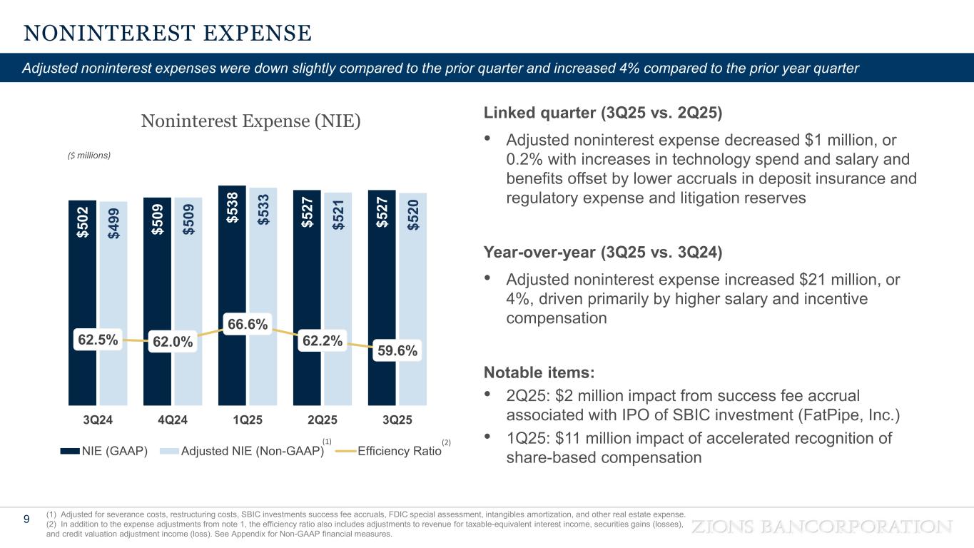 NONINTEREST INCOME AND REVENUE 8 (1) Reflects total customer-related noninterest income, which excludes dividends and other income and net securities gains (losses). Adjusted excludes credit valuation adjustment income (loss). (2) Adjusted revenue is the sum of taxable-equivalent net interest income and noninterest income less adjustments. See Appendix for non-GAAP financial measures. (3) Effective 1Q25, customer-related fee income includes credit valuation adjustment income (loss) in capital markets fees, which was previously disclosed under noncustomer-related noninterest income. Adjusted customer-related noninterest income excludes credit valuation adjustment income.. See Appendix for non-GAAP financial measures. Adjusted customer-related fee income grew 6% versus prior quarter and 8% compared to year-ago quarter Customer-Related Noninterest Income 1,3 ($ millions) $7 92 $8 20 $7 95 $8 38 $8 61 $7 98 $8 21 $8 00 $8 37 $8 72 3Q24 4Q24 1Q25 2Q25 3Q25 Total Revenue (GAAP) Adjusted Revenue (Non-GAAP) Total Revenue 2,3 ($ millions) $1 58 $1 76 $1 58 $1 64 $1 63 $1 61 $1 73 $1 58 $1 64 $1 74 3Q24 4Q24 1Q25 2Q25 3Q25 Customer-Related Noninterest Income Adjusted Customer-Related Noninterest Income