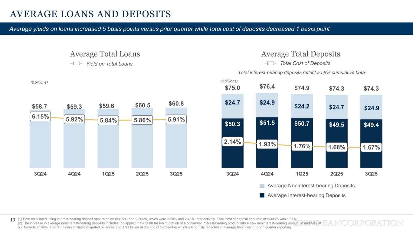 NONINTEREST EXPENSE 9 (1) Adjusted for severance costs, restructuring costs, SBIC investments success fee accruals, FDIC special assessment, intangibles amortization, and other real estate expense. (2) In addition to the expense adjustments from note 1, the efficiency ratio also includes adjustments to revenue for taxable-equivalent interest income, securities gains (losses), and credit valuation adjustment income (loss). See Appendix for Non-GAAP financial measures. Adjusted noninterest expenses were down slightly compared to the prior quarter and increased 4% compared to the prior year quarter Linked quarter (3Q25 vs. 2Q25) • Adjusted noninterest expense decreased $1 million, or 0.2% with increases in technology spend and salary and benefits offset by lower accruals in deposit insurance and regulatory expense and litigation reserves Year-over-year (3Q25 vs. 3Q24) • Adjusted noninterest expense increased $21 million, or 4%, driven primarily by higher salary and incentive compensation Notable items: • 2Q25: $2 million impact from success fee accrual associated with IPO of SBIC investment (FatPipe, Inc.) • 1Q25: $11 million impact of accelerated recognition of share-based compensation $5 02 $5 09 $5 38 $5 27 $5 27 $4 99 $5 09 $5 33 $5 21 $5 20 62.5% 62.0% 66.6% 62.2% 59.6% 3Q24 4Q24 1Q25 2Q25 3Q25 NIE (GAAP) Adjusted NIE (Non-GAAP) Efficiency Ratio ($ millions) Noninterest Expense (NIE) (1) (2)