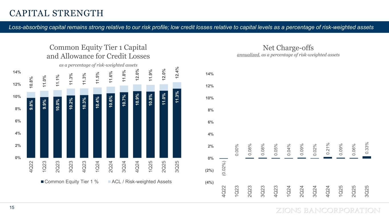CREDIT QUALITY 13 Net charge-offs increased largely due to two related loans while criticized and classified balances declined Key Credit Metrics • Net charge-offs relative to average loans: • 0.37% annualized in 3Q25; includes $50 million, or 0.33%, associated with two related C&I loans • 0.20% over the last 12 months • 0.54%: NPAs / loans + OREO • NPA balance increased $11 million in 3Q25 from 2Q25 • 4.0%: Classified loans / total loans • Classified balance decreased $282 million in 3Q25 from 2Q25 • 4.8%: Criticized loans / total loans • Criticized balance decreased $415 million in 3Q25 from 2Q25 Allowance for Credit Losses • 1.20% of total loans and leases, flat to the previous quarter Credit Quality Ratios 4.5% 5.9% 6.0% 5.4% 4.8% 0.6% 0.5% 0.5% 0.5% 0.5% 3.6% 4.8% 4.8% 4.4% 4.0% 3Q24 4Q24 1Q25 2Q25 3Q25 Criticized / Loans NPAs / Loans + OREO Classified / Loans 191% 234% 229% 224% 213% 1.25% 1.25% 1.24% 1.20% 1.20% 3Q24 4Q24 1Q25 2Q25 3Q25 ALLL / Nonaccrual loans ACL / Loans