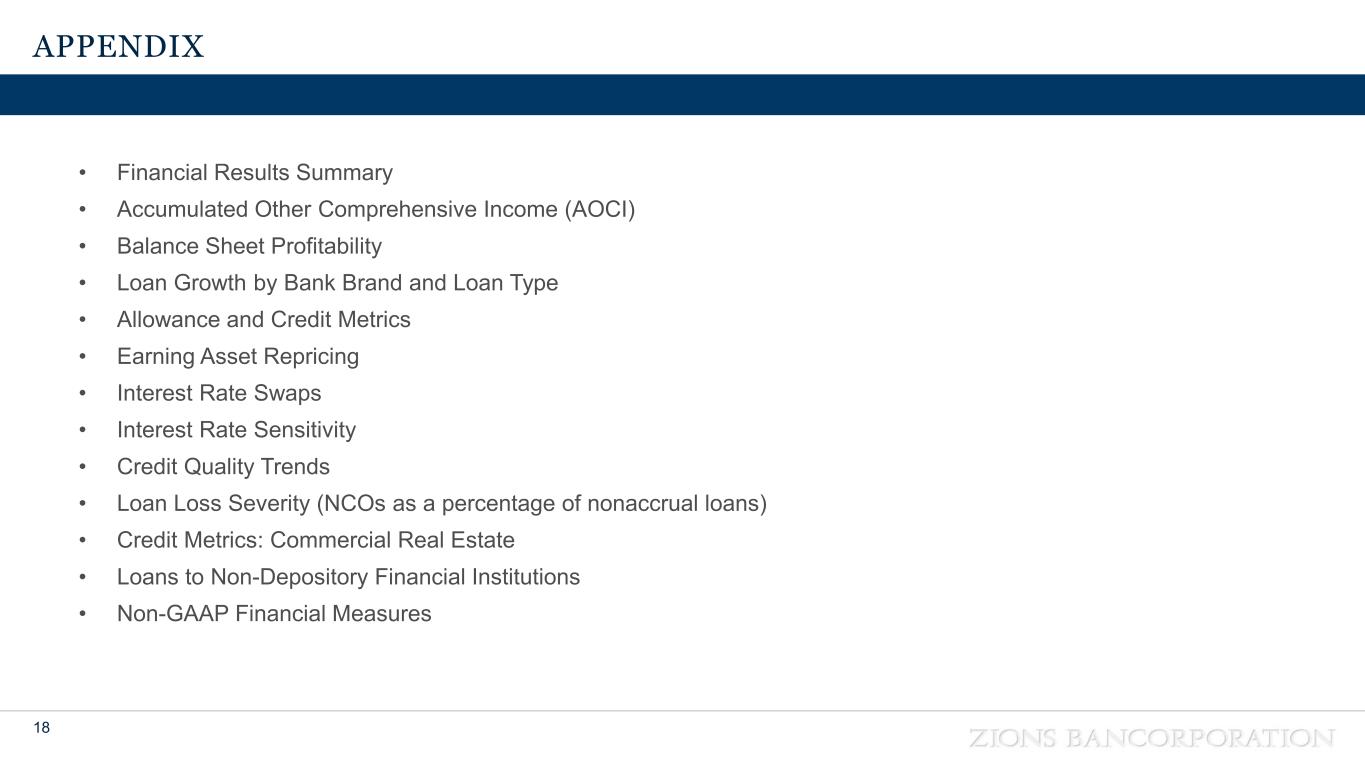 APPENDIX 18 • Financial Results Summary • Accumulated Other Comprehensive Income (AOCI) • Balance Sheet Profitability • Loan Growth by Bank Brand and Loan Type • Allowance and Credit Metrics • Earning Asset Repricing • Interest Rate Swaps • Interest Rate Sensitivity • Credit Quality Trends • Loan Loss Severity (NCOs as a percentage of nonaccrual loans) • Credit Metrics: Commercial Real Estate • Loans to Non-Depository Financial Institutions • Non-GAAP Financial Measures