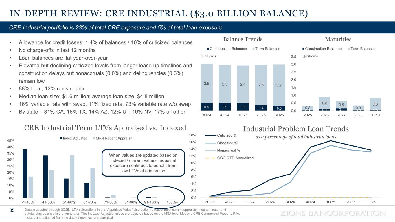 0% 5% 10% 15% 20% 25% 30% 35% 40% <=40% 41-50% 51-60% 61-70% 71-80% 81-90% 91-100% 100%+ Index Adjusted Most Recent Appraisal CRE Multifamily Term LTVs Appraised vs. Indexed IN-DEPTH REVIEW: CRE MULTIFAMILY ($3.9 BILLION BALANCE) 34 Data is updated through 3Q25. LTV calculations in the “Appraised Value” distribution to reflect most current appraisal in denominator and outstanding balance in the numerator. The Indexed Adjusted values are adjusted based on the MSA level Moody’s CRE Commercial Property Price Indices and adjusted from the date of most current appraisal. CRE Multifamily portfolio is 29% of total CRE exposure and 6% of total loan exposure • Allowance for credit losses: 2.1% of total multifamily balances / 12% of criticized balances • No charge offs in last 12 months • Loan balances are flat year-over-year • Elevated but declining criticized levels from longer lease up timelines and construction delays but nonaccruals (0.0%) and delinquencies (0.0%) remain low • 75% term, 25% construction • Median loan size: $1.1 million; average loan size: $5.6 million • 16% variable rate with swap, 12% fixed rate, 72% variable rate w/o swap • By State – 29% TX, 25% CA, 13% UT, 9% AZ, 7% WA, 17% all other Multifamily Problem Loan Trends as a percentage of total multifamily loans When values are updated based on indexed / current values, multifamily exposure continues to benefit from low LTVs at origination ($ billions)($ billions) 0.0 0.5 0.3 0.1 0.00.3 1.1 0.5 0.2 0.8 0.0 0.5 1.0 1.5 2.0 2.5 3.0 3.5 4.0 4.5 2025 2026 2027 2028 2029+ Maturities Construction Balances Term Balances 0% 5% 10% 15% 20% 25% 3Q23 4Q23 1Q24 2Q24 3Q24 4Q24 1Q25 2Q25 3Q25 Criticized % Classified % Nonaccrual % GCO QTD Annualized 1.1 1.1 1.0 0.9 1.0 2.8 2.9 3.1 3.1 2.9 3Q24 4Q24 1Q25 2Q25 3Q25 Balance Trends Construction Balances Term Balances