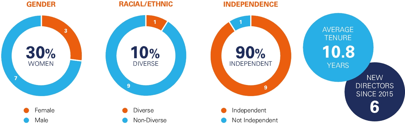 | | Director Tenure | | | The average tenure of our independent Directors will be 10.8 years as of the date of the Annual Meeting, and six of our current independent Directors have joined the Board of Directors since 2015. | |